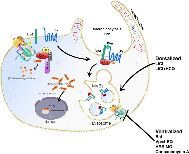 Figure 5. Model of membrane trafficking during Wnt signaling highlighting the role of macropinocytosis, V-ATPase, MVBs, and lysosomes. Binding of Wnt to the Frizzled (Fz) and Lrp6 receptors results in a local inhibition of GSK3 activity that induces the actin machinery to form lamellipodia that engulf large amounts of liquid through macropinocytosis. In the presence of Wnt, plasma membrane is trafficked into MVBs that become lysosomes as they are activated by progressively decreasing pH. V-ATPase pumps protons into the lysosomal lumen, driving lysosomal acidification. Inhibiting V-ATPase (Baf or Concanamycin A) or MVB formation (Vps4-EQ or Hrs-MO) results in microcephalic embryos with increased ventral structures. LiCl mimics Wnt signaling by inhibiting GSK3, and low-dose HCQ expands the MVB compartment, facilitating Wnt signaling in mammalian cells and the dorsalization of Xenopus embryos. |