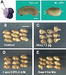 SI Appendix, Fig. S8. The ESCRT machinery component HRS is required for axis formation, and twinning by microinjected cytoplasmic determinant Hwa requires membrane trafficking. (A) Microinjection of antisense Hrs MO, known to specifically block MVB formation, interferes with axis formation. Embryos were injected with MOs 2 times dorsally at the 4-cell stage, as indicated by the diagram. Arrowhead indicates the defect in head and cement gland formation. The results indicate that the ESCRT machinery is required for axis formation. (B) Uninjected controls for the Hwa experiment. (C) Hwa mRNA induces 100% of complete secondary axes. In our hands, Hwa is even more effective than xWnt8 in inducing complete twinning. (D) Co-injection of the Na+/H+ exchanger inhibitor EIPA (2 mM) abolishes Hwa activity. (E) Interfering with MVB formation by co-injection of Hrs MO (0.3 mM, 4 nl) prevents Hwa function. Together with the inhibition of Hwa by Baf (Fig. 4H-J in main text), this result strongly suggests that function of the Hwa transmembrane protein requires membrane trafficking. A, anterior; P, posterior. Numbers of embryos analysed were; control embryos in A n=115, HRS MO n=107, 7 independent experiments; B=148; C=142; D=120 (3 independent experiments); E=45 per condition. Scale bars for A 500 ïm, for B, 2 mm. |