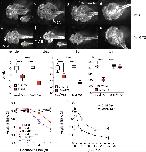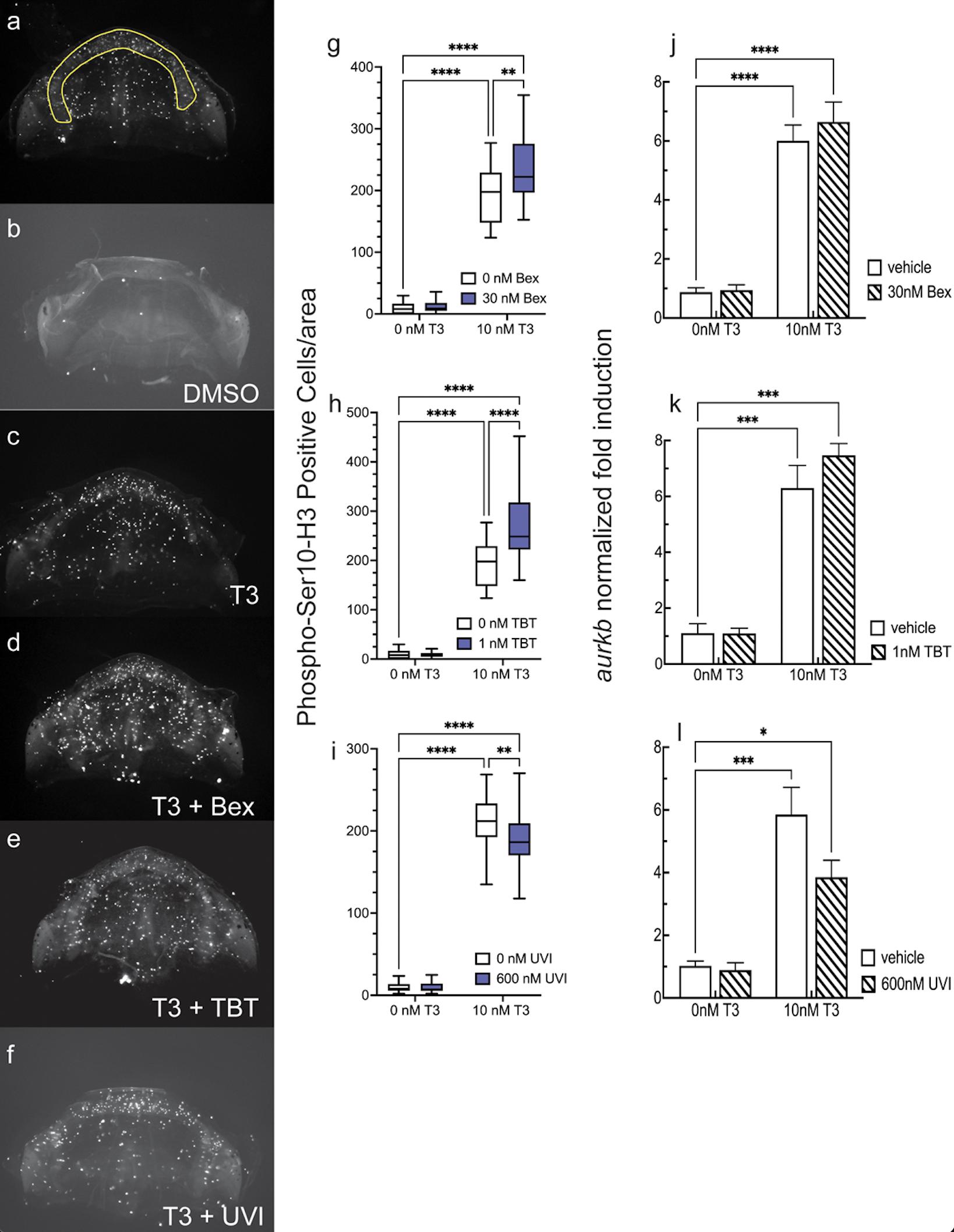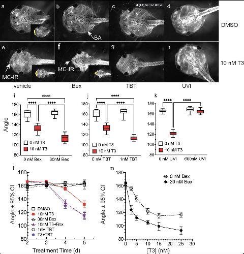 a-h: Representative dorsal head photos of tadpoles treated for five days starting at 1wk-PF (as indicated: DMSO, 10 nM T3, and 30 nM Bex, 1 nM TBT, 600 nM UVI with or without T3). i-k: Quantification of changes to the LJ angle. Boxes represent 25th-75th percentiles with the line at the median (n = 10â15 from 2â3 clutches), and whiskers represent the min and max values. Statistics show results from Sidakâs multiple comparison test in conjunction with 2-way ANOVA (****, p < 0.0001). l: Effect of Bex and TBT on T3-induced LJ angle changes as a function of time. Data points represent means from 20 animals from two different clutches; error bars delineate the 95% confidence intervals, indicating statistical significance. m: Treatment with 30 nM Bex augments LJ angle narrowing as a function of T3 dose. Statistics are the same as in the time course, although the clutches were different.