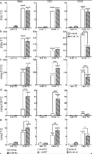 Left column: The effect of RXR agonist Bex on T3-induced gene expression. Middle column: The effect of environmental RXR agonist TBT on T3-induced genes. Right column: The effect of RXR antagonist UVI on T3-induced genes. Striped bars indicate the presence of the RXR ligand, and white bars show induction in the absence of the RXR ligand. Statistics show results from Sidakâs multiple comparison test in conjunction with 2-way ANOVA (****, p < 0.0001; ***, p < 0.001; **, p < 0.01; *, p < 0.05).