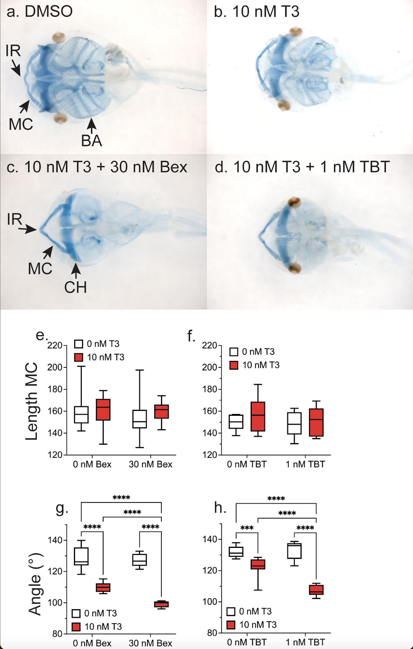 Representative ventralhead photos of tadpoles treated for five days starting at 1wk-PF with vehicle (DMSO, a), 10 nM T3 (b), 10 nM T3 + 30 nM Bex (c), or 10 nM T3 + 1 nM TBT (d) and then stained with Alcian blue to visualize cartilage. MC, Meckelâs cartilage; IR, infracostal cartilage; CH, ceratohyalcartilage; and BA, branchial arches. e-f: Meckelâs cartilage lengths do not change with treatment. g-h: Changes in LJ angle measured from the end of the MC to the middle of the IR to the end of the opposite MC. Box plots are as in Fig 1 (n = 10 from 2 clutches of five per treatment. Statistics show results from Sidakâs multiple comparison test in conjunction with 2-way ANOVA (****, p < 0.0001; ***, p < 0.001).