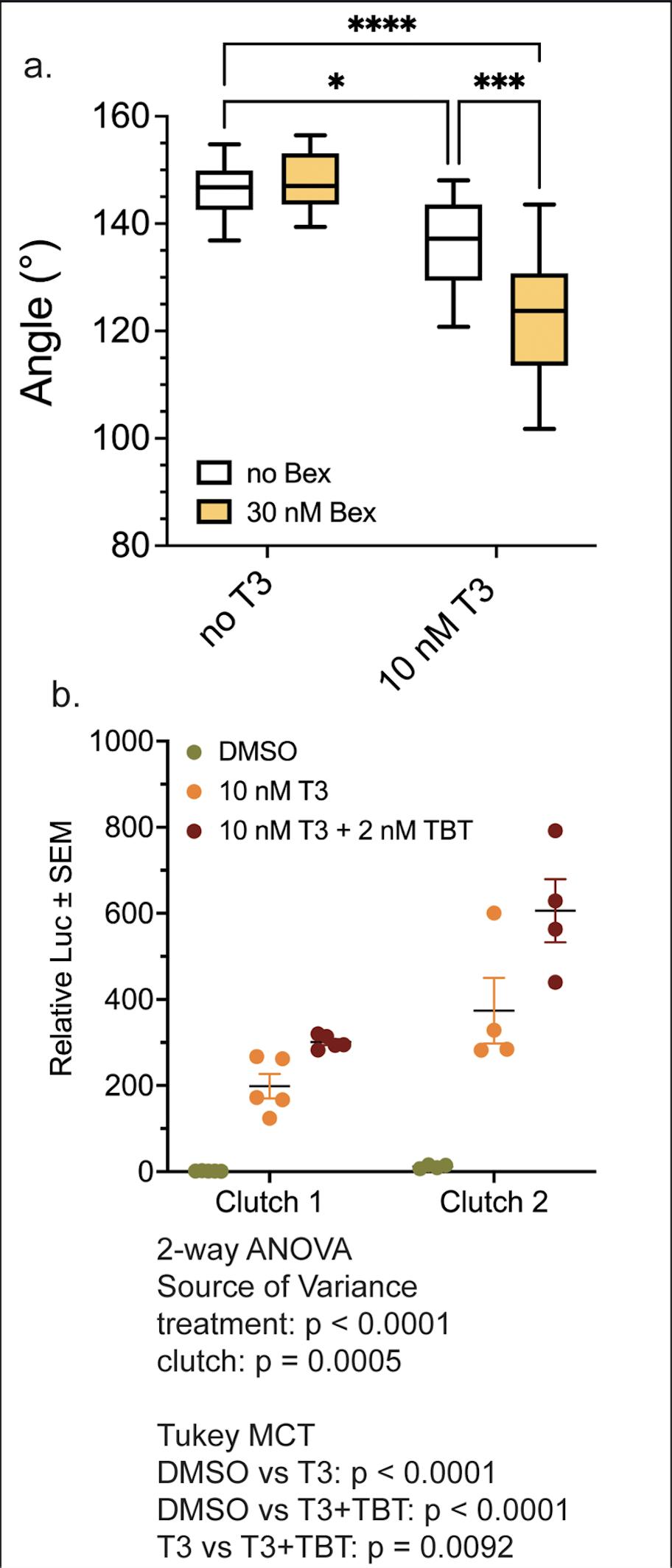 a. Bex potentiates the T3-induced decrease in the LJ angle in NF 54 tadpoles treated for three days. Boxes and statistics are as in Fig 1 (n = 14 jaws from 3 clutches). Statistics show results from Sidak’s multiple comparison test in conjunction with 2-way ANOVA (****, p < 0.0001; ***, p < 0.001; *, p < 0.05). b. TBT potentiates T3-inducible, integrated luciferase reporter expression in the LJ of NF 54 tadpoles.