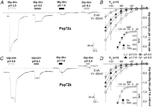 Figure 5. Transport of Gly‐Gln in Xenopus oocytes expressing Atlantic salmon PepT2a (A, B) and PepT2b (C, D)In A and C, representative traces (1 mmol l−1 Gly‐Gln in NaCl solution), the dashed line represents the baseline (conventionally fixed at the value in NaCl solution at pH 7.6). B and D, current/voltage relationships (the values are the means (SD) of the current normalized to the mean value of the current at −140 mV and pH 7.6); insets, currents at pH 6.5 in the presence of 98 mmol l−1 NaCl or tetraethylammonium chloride. Data are means (SD) from 4–24 oocytes from 1–5 batches.