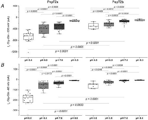 Figure 6. Box plots of the transport current values recorded as reported in Fig. 5, for PepT2a (left) and PepT2b (right) at −120 mV (A) and at −60 mV (B)Dots indicate the single oocyte transport current value. In the top part of each figure the statistical comparison between different pH conditions for each transporter is shown. In the bottom, the statistical comparison between transporters at the same pH (two‐sample t test or Mann‐Whitney's U test; *