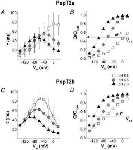 max) for Atlantic salmon PepT2 transportersPepT2a in A and B and PepT2b in C and D. τ/V in A and C and (Q/Q