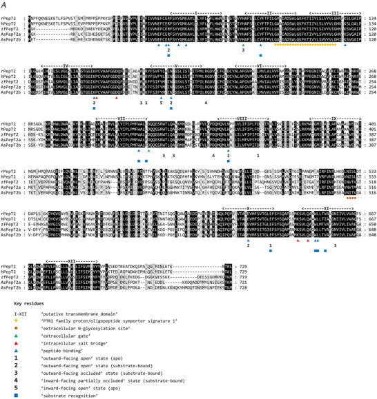 Figure 2. Phylogenetic relationship of fish and mammalian PepT2 based on predicted protein sequencesThe (unrooted) phylogenetic tree was constructed based on deduced PepT2 amino acid sequences using the maximum likelihood method, 1000 bootstrap replicates, and Jones‐Taylor‐Thornton + G matrix‐based model in MEGA X. The percentage of trees in which the associated taxa clustered together is shown next to the branches. Protein Acc. Nos. for GenBank or Ensembl databases are provided next to species common name. [Colour figure can be viewed at wileyonlinelibrary.com]