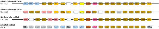 Figure 3. Synteny analysis of slc15a2 genomic region in teleostsFrom top, slc15a2a and slc15a2b genes from Atlantic salmon (Salmo salar), slc15a2 from Northern pike (Esox lucius) and zebrafish (Danio rerio). The chromosome (Chr) number is indicated below each species name. The central pentagons in dark orange indicate the slc15a2 genes. For each slc15a2 gene, 10 flanking genes upstream and downstream are represented by different coloured pentagons. Each colour identifies sets of orthologous genes based on the degree of conservation between species and between the chromosomes within species and white pentagons represent non‐identified genes. The pentagons point in the direction of transcription and only protein‐coding genes are indicated. [Colour figure can be viewed at wileyonlinelibrary.com]