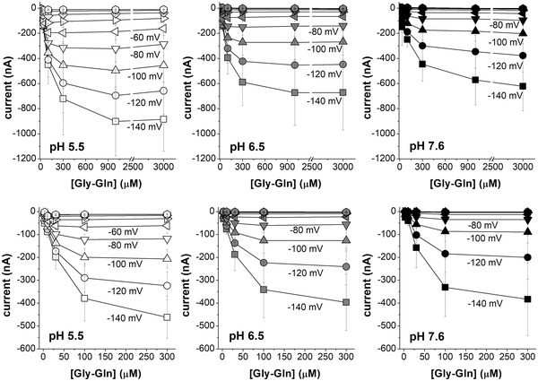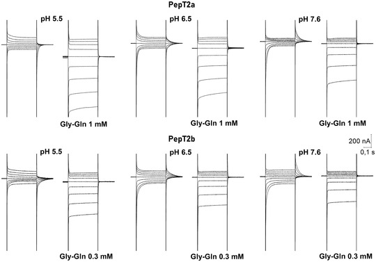Figure 9. Representative traces of currents elicited by voltage steps protocol applied to Xenopus oocytes expressing the Atlantic salmon PepT2 transporters, PepT2a (top) and PepT2b (bottom)The voltage pulses were in the range −140 to +20 mV. At all tested pH, the presence of saturating concentrations of Gly‐Gln (1 mmol l−1 for PepT2a and 0.3 mmol l‐1 for PepT2b) eliminates the transporter transient component (I