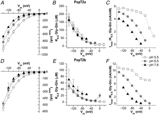 The mean value of the currents at each concentration (from 3 μmol l−1 to 3 mmol l−1 for PepT2a and from 3 μmol l−1 to 300 μmol l−1 for PepT2b) are plotted at the indicated voltage and pH. Data are means (SD) from 10–19 oocytes, obtained from 2–3 batches. The full series of the mean values (SD) for each concentration, voltage and pH are reported in the statistical summary document. The raw data are available at the link given in the data availability statement.