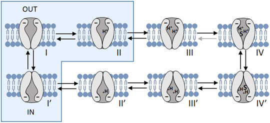 Figure 12. Representation of two kinetic models for PepT2 transporterEach configuration represents a state, from I to IV (outside) and from I’ to IV’ (inside). The presteady‐state currents arise from the redistribution of the negatively charged transporter between states I’, I and II (blue boxes). The binding of the first external proton to state I accelerates the inward rate constant, while the binding of a second proton to state II leads to state III, effectively slowing down the outward rate. Transitions between I’, I and II are voltage dependent. S represents the binding of the substrate. Modified from Chen et al. (1999) and Sala‐Rabanal et al. (2008). [Colour figure can be viewed at wileyonlinelibrary.com]