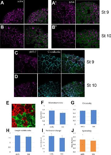 Figure 5-Figure Supplement 3. Cytoskeleton and Cell motility. Actin (magenta) and yolk autofluorescence (green) in the upper and lower IMZ at Stages 9 (A, Aâ) and 10 (B, Bâ); vegetal is to the left. Loose cell organization is a by-product of the rapid fixation used to allow Phalloidin staining. pMLC (magenta) and C-cadherin (cyan) in the upper IMZ at Stages 9 (C) and 10 (D). Fluorescently labeled cells in deep cell explants of upper IMZ were imaged via LSCM (Video 19) and their outlines and centroids were tracked and analyzed. Mean movement rate of the centroid over 2â3 min intervals (E), mean Circularity ( = 4Ï*(area)/(perimeter)^2, such that 1 = a perfect circle) (F), mean Aspect ratio (length:width ratio of an ellipse fit to the cell outline) (G), and mean Perimeter Length change (H) show no significant differences between Stages 9â9.5 (âearlyâ) and Stage 10 (âlateâ). Dissociated deep IMZ cells were plated on C-cadherin-Fc and imaged with DIC optics (Video 20) and their outline was tracked and analyzed at 5â16 min intervals. The rate of cell spreading was not significantly different at Stage 9â9.5 vs. Stage 10 (I). Error bars for E-I are standard error of the mean. |