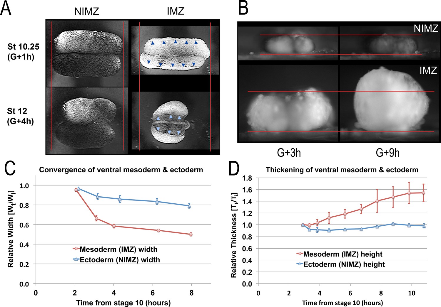 Figure 3. Quantitation of convergence and thickening in IMZ vs. NIMZ regions of explants. Double ventral NIMZ and IMZ sandwich explants (see Figure 1âfigure supplement 1A8) were used to examine the autonomous rates of convergence and thickening in each region, by imaging both from above (A, Video 9*) and from the side, viewing the lateral edge (B, Video 10*); pointers in A indicate the edge of the superficial epithelium on the IMZ explant, red lines in A and B indicate the initial width or height of the explants. Explant width (C; n = 6 explants per time point) and thickness (D; n = 2 explants per time point) were measured over time (Wt and Tt respectively; see Materials and methods for details) and plotted with respect to the initial value (Wi and Ti); error bars = SEM. Measures for C and D were made from the same explants at sequential time points. |