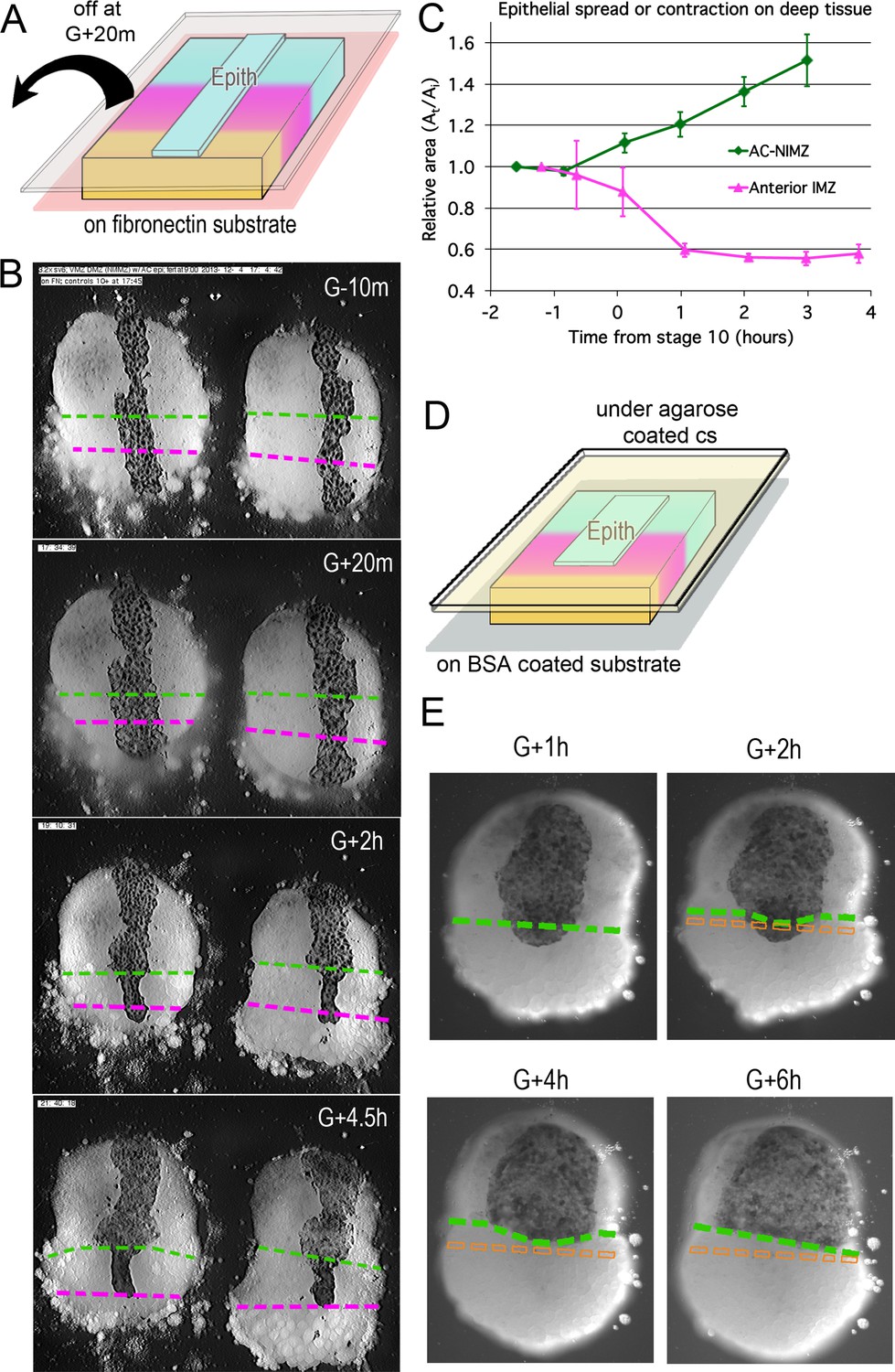 Figure 5-Figure Supplement 2. Test of epithelial thickness; test of surface tension vs. strain; test of IMZ pushback; behavior of deep IMZ plus NIMZ tissue explants. (A) Model for the development of IFT between superficial (yellow) and deep layers (red-ish) of the IMZ; prior to Stage 10- (top), the superficial epithelium and deep tissue have high affinity for each other, so low IFT; beginning at Stage 10-, affinity decreases (middle), increasing IFT and leading the deep tissue to round up (bottom). One possibility is that the epithelium columnarizes (Bottom, yellow cells), to match the new, lower surface area of the deep tissue. (B) Thickness of the non-bottle cell epithelium of the IMZ in both whole embryos (WE) and explants declines during the first two hours of gastrulation (based on RDA-labeled explants and embryos as showing in Figure 3âfigure supplement 1A,B, 2 A). The IFT of small sandwiches of both AC (C) and IMZ (D) over a range of strains. (E) DIMZ wontons held under the MicroSquisher platen, initially at 0.3 μN, develop additional compression force over three hours (e.g. Video 15*, on which the dark blue line is based). The mean time of force increase, G-41m, is indicated (red arrow). (F) Explants of about 90° of deep ventral and dorsal upper IMZ plus NIMZ tissue (VMZ and DMZ) under a cover glass (upper panels). The upper IMZ (red outline in lower panels) begins to engulf the NIMZ (blue outline) in both VMZ and DMZ explants (green arrows), but at Stage 10.5, IMZ in the DMZ explant reverses course and begins to converge and extend (magenta arrows; Video 16*, 21*; see also Video 17*). |