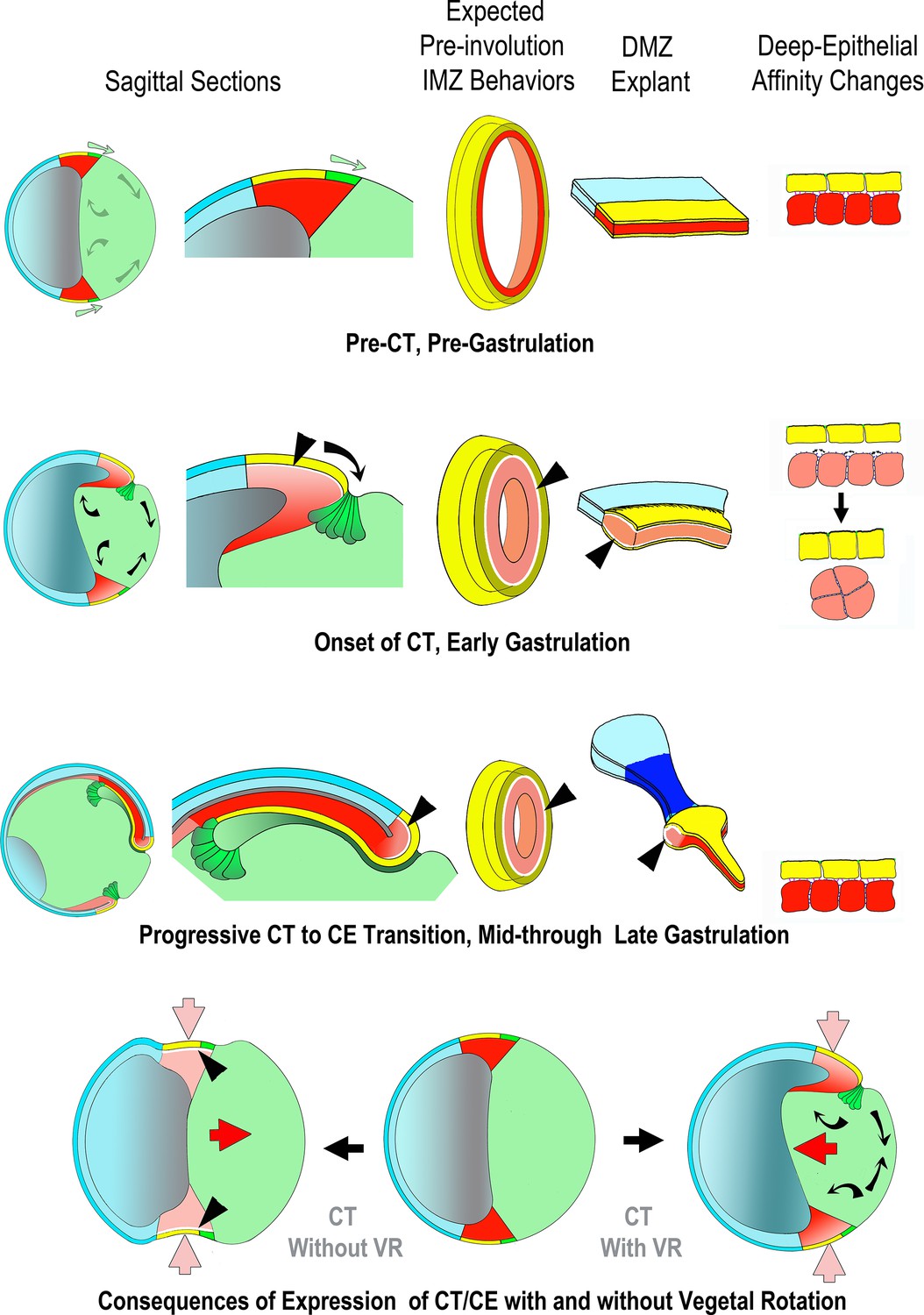 Figure 8. Proposed mechanism of CT, its function in the gastrula and in explants, its relationship to CE and its integration with the other movements of gastrulation. Yellow/green = endoderm, pink/red = mesoderm, blue = ectoderm (See Figure 1 for details). Prior to the onset of gastrulation (top row), vegetal rotation (VR) (Sagittal Sections, gray arrows) has not yet occurred and the IMZ annulus (3rd column) remains stable, as does the IMZ explant (4th column), due to a stable deep-epithelial cell affinity (far right). With the onset of gastrulation and CT (2nd row), apical constriction of the lower IMZ epithelium (bottle cell formation â Sagittal Sections, dark green), VR, involution and invagination begin (Sagittal Sections, black arrows). Co-incident with bottle cell formation, the deep mesodermal tissue begins to lose its affinity with the overlying epithelium. During early gastrulation both tissue surface tension of the IMZ as a whole and its interfacial tension with an epithelium increase, resulting in a tendency for the IMZ to minimize its surface area by converging and thickening (2nd row, far right). This loss of affinity at the interface of deep and epithelial tissue (2nd and 3rd rows, shown by white spaces between epithelial and deep, at black arrowhead pointers) increases the IFT between deep and superficial layers, resulting in both convergence and thickening of the IMZ of the explants (CT, second row, bulge in DMZ explant). Increased IFT would have a tendency to thicken and decrease the circumference of the IMZ annulus in embryos (3rd column, 2nd row) were it not resisted by adjacent tissue, so instead generates a pre-involution tensile force around the blastopore and converges, but does not thicken (not shown). In explants, the weak affinity of the IMZ epithelium to the underlying deep region results in its retraction, initially from the leading edge mesoderm (not shown), whereas in the intact embryo, the IMZ epithelium is tightly attached at its vegetal edge to the forming bottle cells, which in turn are tightly attached to the adjacent vegetal endodermal tissues. Thus the IMZ epithelium is pulled along with the bottle cells as they move inside the blastopore (1st, 2nd column). During early involution, as the lower edge of the IMZ involutes, it transitions from expressing CT to expressing directed migration (2nd column, 2nd row), and during later involution, the upper IMZ transitions to expressing CE (2nd column, 3rd row). In the case of CE, this transition is accompanied by regaining a high deep-epithelial affinity (loss of white space, on involution, 2nd column, 2nd and 3rd rows). In explants, the later transition from CT to CE first occurs in tissue laying dorsally at the vegetal edge of the upper IMZ, and continues in an anterior to posterior progression (Shih and Keller, 1992a). The snout of tissue extending from the thickened collar of mesoderm in the explant reflects the onset of CE and is coincident with the progressive return of the affinity between the deep cells and the bottle cell epithelium (3rd row, 4th column). In the meantime, VR (black arrows, 1st column, 2nd row) has moved the vegetal endoderm inward at the onset of gastrulation such that convergence force generated by CT cooperates with VR to move the IMZ vegetally and push the vegetal endoderm inside (compare to 1st column, 1st row). VR, CT and CE also cooperate to stretch the ectodermal (NIMZ-AC) region by pulling it vegetally (1st column, 1st to 3rd rows). When CE begins at Stage 10.5, it has been positioned by the actions of CT and VR such that it further moves the IMZ vegetally and pushes the vegetal endoderm inside (4th row, right, red arrow), in contrast to converging in its initially more equatorial position, where it would tend to push the vegetal endoderm out, rather than in (4th row, left, red arrow). |