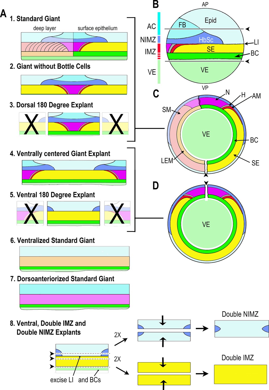 Figure 1-Figure Supplement 1. Description of explant construction. Various types of sandwich explants that included some or all of the Marginal Zone were made at Stage 9â10.25 for use in this work (A). Lateral view of the pre-gastrulation embryo (B) (Stage 10-) with animal pole (AP) at the top and vegetal pole (VP) at the bottom, showing presumptive tissues and the ranges of the AC, NIMZ, IMZ, and VE regions (colored bar). AC and NIMZ are ectodermal, the deep layers of the IMZ are mesodermal, whereas the superficial layer is either mesodermal (dorsally) or endodermal (laterally and ventrally); see below for details. Upper and lower regions of the IMZ are indicated (solid vs. broken red). The Limit of Involution (LI) lies at the boundary between the NIMZ and the IMZ and divides the mesodermal and endodermal tissues that will be internalized (below the LI) from the ectodermal tissues that will remain outside (above the LI). Images of whole embryos showing tissue fates are shown in lateral (B) and in vegetal view, with the epithelial tissues removed to show the underlying deep tissues in the left half (C) and with the epithelial tissues left intact (D). Presumptive tissue fates in the superficial (epithelial) layer: Light blue = epidermis (Epid), darker blues = neurectoderm (Forebrain (FB), hindbrain-spinal cord (HbSc)); magenta = notochord (N), gray = hypochord (H), red = adaxial somitic mesoderm (AM); yellow = supra-blastoporal endoderm (SE), bright green = presumptive bottle cells (BC, also SE); pale green is vegetal endoderm (VE) or âsub-blastoporalâ endoderm. Presumptive fates in the deep layer of the Marginal Zone are shown in the left half of C and A1, and in the entire IMZ in A6,7: light orange = leading edge mesoderm (LEM, migratory mesoderm); light red = somitic mesoderm (SM); light magenta = notochordal mesoderm. Standard âGiantâ sandwich explants (A1) were made of the entire Marginal Zone with bottle cells and some vegetal endoderm included (Shook et al., 2004), the âstandardâ version for this work. Embryos were first cut ventrally (pointer in C), then AC and VE tissue removed as indicated (above and below pointers and lines in B) and VE was removed from the inner face of the IMZ (see Figure 1A, St 10-). Two such explants were then pressed under cover glass to make a sandwich, inner face to inner face, to allow the epithelium to heal together around the edges. To make Giants without bottle cells (A2), all VE and some or all of the bottle cells were additionally removed from the explants prior to sandwiching (Poznanski et al., 1997). Ventrally centered giant sandwich explants (A4) were made as for standard giants, but initially cutting along the dorsal (pointer in D), rather than ventral midline. Dorsal 180° (D180) (A3), and Ventral 180° (V180) (A5) explants are made as standard or ventrally centered giants, with the ventral or dorsal 180°, respectively, of the marginal zone cut off. Ventralized (A6) or dorsoanteriorized (A7) giant explants were made from ventralized or dorsoanteriorized embryos, cut without reference to âdorsalâ, as these embryos are symmetrical about the blastopore (Scharf and Gerhart, 1980; Kao and Elinson, 1988). Double ventral or dorsal, IMZ or NIMZ only sandwich explants (A8) were made by first constructing V180 explants with most of the presumptive bottle cells removed, allowing them to heal together at least 15 min, then cutting out the NIMZ and IMZ regions, avoiding the LI, and recombining two NIMZ- or two IMZ-only pieces with their newly cut posterior edges (those closest to the LI) juxtaposed and pressed together by two cover glass bits against the outer, anterior surfaces of the individual pieces. The epithelia at the cut edges heal together rapidly, preventing artifacts resulting from extended healing of the epithelium over the cut face. The doubled explants were allowed to heal for 30 min to 1 hr before being moved onto a cover glass platform in front of a 45° mirror in the culture dish, with the lateral edge of the explant facing the mirror, such that we could image both convergence (from above) and thickening (from the side). Convergence is reported from the point at which cover glass is lifted from the initial sandwiches, prior to cutting apart the IMZ and NIMZ portions of the explants. Thickness is reported from the time the two IMZ or NIMZ regions heal together. As a consequence of the explant construction process, our measures do not capture the initial ~25% convergence of the IMZ with respect to its initial mediolateral extent in the embryo or the initial ~50% thickening of the IMZ with respect to its initial thickness in the embryo. NIMZ explants show little or no change in thickness over the course of explant construction. See Materials and methods for general details of explant construction. |
