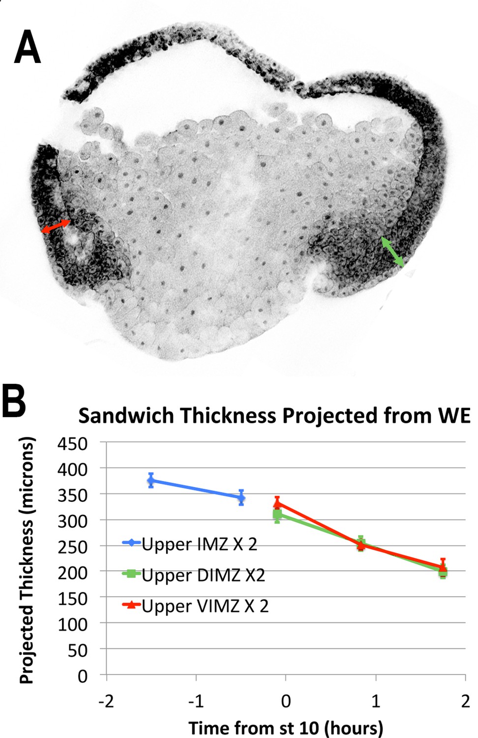 Figure 3-Figure Supplement 2. LSCM images of RDA injected embryos (A) were used to measure regional thickness of the IMZ and NIMZ, before and during early gastrulation. In gastrula stage embryos, the thickness of the upper (more animal) IMZ was measured dorsally and ventrally (A, green and red double-headed arrows, respectively). The thickness of the lower IMZ in whole embryos after the onset of gastrulation is more ambiguous, so is not reported. In pre-gastrula embryos, upper IMZ thickness was measured on opposite sides and averaged (not shown). The expected thickness that would result from sandwich explants made from embryos at time points, assuming no change upon explantation, for purposes of comparison (B). |