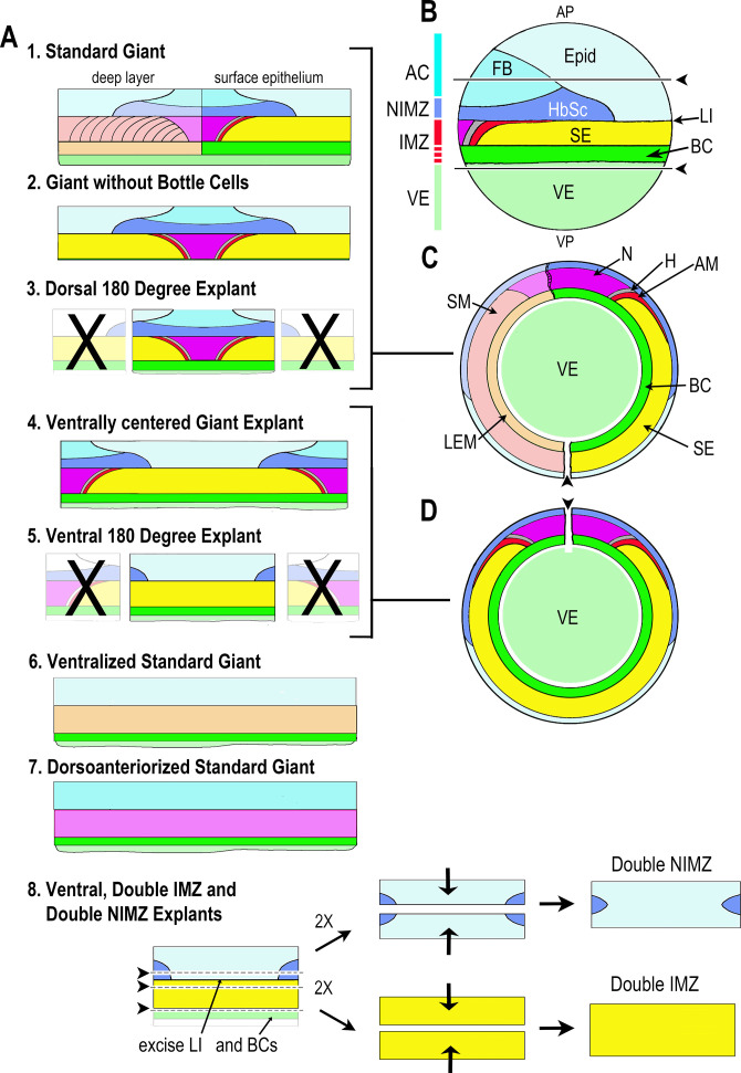 Figure 1—figure supplement 1. Description of explant construction.Various types of sandwich explants that included some or all of the Marginal Zone were made at Stage 9–10.25 for use in this work (A). Lateral view of the pre-gastrulation embryo (B) (Stage 10-) with animal pole (AP) at the top and vegetal pole (VP) at the bottom, showing presumptive tissues and the ranges of the AC, NIMZ, IMZ, and VE regions (colored bar). AC and NIMZ are ectodermal, the deep layers of the IMZ are mesodermal, whereas the superficial layer is either mesodermal (dorsally) or endodermal (laterally and ventrally); see below for details. Upper and lower regions of the IMZ are indicated (solid vs. broken red). The Limit of Involution (LI) lies at the boundary between the NIMZ and the IMZ and divides the mesodermal and endodermal tissues that will be internalized (below the LI) from the ectodermal tissues that will remain outside (above the LI). Images of whole embryos showing tissue fates are shown in lateral (B) and in vegetal view, with the epithelial tissues removed to show the underlying deep tissues in the left half (C) and with the epithelial tissues left intact (D). Presumptive tissue fates in the superficial (epithelial) layer: Light blue = epidermis (Epid), darker blues = neurectoderm (Forebrain (FB), hindbrain-spinal cord (HbSc)); magenta = notochord (N), gray = hypochord (H), red = adaxial somitic mesoderm (AM); yellow = supra-blastoporal endoderm (SE), bright green = presumptive bottle cells (BC, also SE); pale green is vegetal endoderm (VE) or ‘sub-blastoporal’ endoderm. Presumptive fates in the deep layer of the Marginal Zone are shown in the left half of C and A1, and in the entire IMZ in A6,7: light orange = leading edge mesoderm (LEM, migratory mesoderm); light red = somitic mesoderm (SM); light magenta = notochordal mesoderm. Standard ”Giant” sandwich explants (A1) were made of the entire Marginal Zone with bottle cells and some vegetal endoderm included (Shook et al., 2004), the ‘standard’ version for this work. Embryos were first cut ventrally (pointer in C), then AC and VE tissue removed as indicated (above and below pointers and lines in B) and VE was removed from the inner face of the IMZ (see Figure 1A, St 10-). Two such explants were then pressed under cover glass to make a sandwich, inner face to inner face, to allow the epithelium to heal together around the edges. To make Giants without bottle cells (A2), all VE and some or all of the bottle cells were additionally removed from the explants prior to sandwiching (Poznanski et al., 1997). Ventrally centered giant sandwich explants (A4) were made as for standard giants, but initially cutting along the dorsal (pointer in D), rather than ventral midline. Dorsal 180° (D180) (A3), and Ventral 180° (V180) (A5) explants are made as standard or ventrally centered giants, with the ventral or dorsal 180°, respectively, of the marginal zone cut off. Ventralized (A6) or dorsoanteriorized (A7) giant explants were made from ventralized or dorsoanteriorized embryos, cut without reference to ‘dorsal’, as these embryos are symmetrical about the blastopore (Scharf and Gerhart, 1980; Kao and Elinson, 1988). Double ventral or dorsal, IMZ or NIMZ only sandwich explants (A8) were made by first constructing V180 explants with most of the presumptive bottle cells removed, allowing them to heal together at least 15 min, then cutting out the NIMZ and IMZ regions, avoiding the LI, and recombining two NIMZ- or two IMZ-only pieces with their newly cut posterior edges (those closest to the LI) juxtaposed and pressed together by two cover glass bits against the outer, anterior surfaces of the individual pieces. The epithelia at the cut edges heal together rapidly, preventing artifacts resulting from extended healing of the epithelium over the cut face. The doubled explants were allowed to heal for 30 min to 1 hr before being moved onto a cover glass platform in front of a 45° mirror in the culture dish, with the lateral edge of the explant facing the mirror, such that we could image both convergence (from above) and thickening (from the side). Convergence is reported from the point at which cover glass is lifted from the initial sandwiches, prior to cutting apart the IMZ and NIMZ portions of the explants. Thickness is reported from the time the two IMZ or NIMZ regions heal together. As a consequence of the explant construction process, our measures do not capture the initial ~25% convergence of the IMZ with respect to its initial mediolateral extent in the embryo or the initial ~50% thickening of the IMZ with respect to its initial thickness in the embryo. NIMZ explants show little or no change in thickness over the course of explant construction. See Materials and methods for general details of explant construction. |