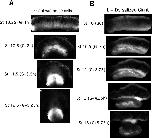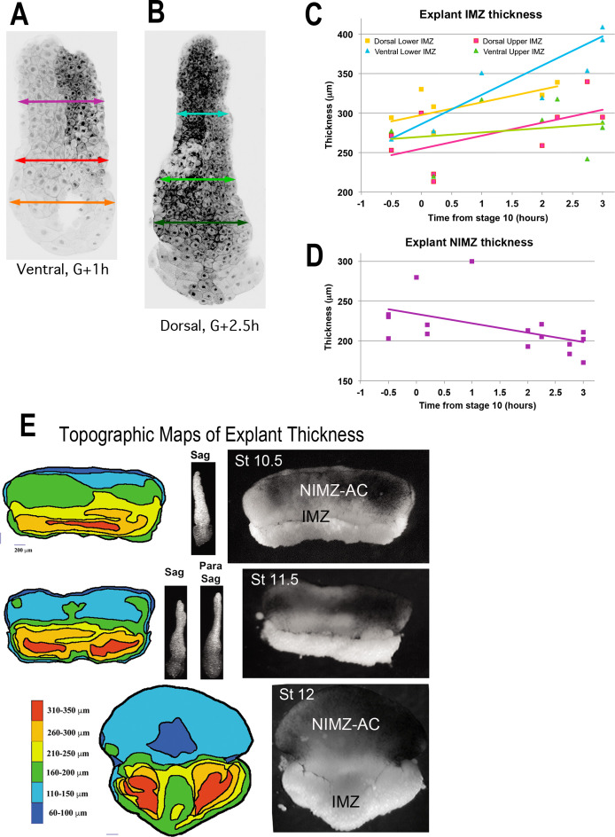Figure 3-Figure Supplement 1. Giant sandwich explants were made from rhodamine dextran amine (RDA) labeled embryos (A,B) prior to the onset of gastrulation, allowed to heal under a cover glass for 30 minutes, then allowed to equilibrate for at least 1 hour after cover glass removal, prior to fixation. Explants were then cut parasagittally in the dorsal and ventral regions and the resulting âchopsâ were imaged with LSCM parallel to the cut surface. The total thickness of the lower and upper IMZ and the NIMZ as in the examples shown (A, B), were measured for explants fixed at timepoints (C, D). This revealed that the lower portion of the ventral IMZ thickened the most during early gastrulation, whereas the upper portion of the ventral IMZ thickened the least; similarly, the lower dorsal IMZ remained thicker than the upper dorsal IMZ (C). During this period, the NIMZ of both thinned (D). For C and D, each time point represents a single measure; 1â2 measures were made from each of 5â7 different explants, fixed at various time point. These data were highly variable in these types of explants, especially in the IMZ where the subtle variations of explant construction come into play. To resolve the spatial pattern of thickening of the pre-involution IMZ in explants, we made standard giant explants at Stage 9.5 (G-1h) from RDA injected embryos, fixed them at mid-gastrula stages, and imaged them en face with LSCM to generate topographic maps of thickness (left column). Corresponding giant explants just prior to fixation (right column) and lateral views reconstructed from confocal stacks (center column). Explants just before onset of CE show a thickened IMZ (Stage 10.5, yellow and orange) and a thinner NIMZ (Stage 10.5, blue and green). The thickness at the vegetal edge of IMZ consists of the leading edge mesoderm and a small amount of attached VE (right, Stage 10.5â11.5, lighter tissue at vegetal edge; left, band contiguous with red), which rounds up after being exposed to the media by the retracting bottle cell epithelium. Beginning at Stage 11, the medial region of the IMZ begins thinning (Stage 11.5, 12), which reflects radial intercalation of the notochord and somitic tissues prior to MIB and CE (Wilson and Keller, 1991). The upper (animal) portion of the IMZ remains relatively thick across its top throughout gastrulation (left, Stage 11.5, upper orange and yellow band; Stage 12, medial yellow arc contiguous with upper orange laterally). The extreme thinning of the central region of NIMZ (left, Stage 12, dark blue), reflects the center part of the posterior neural ectoderm, which is undergoing CE at this point (see Keller and Danilchik, 1988). |