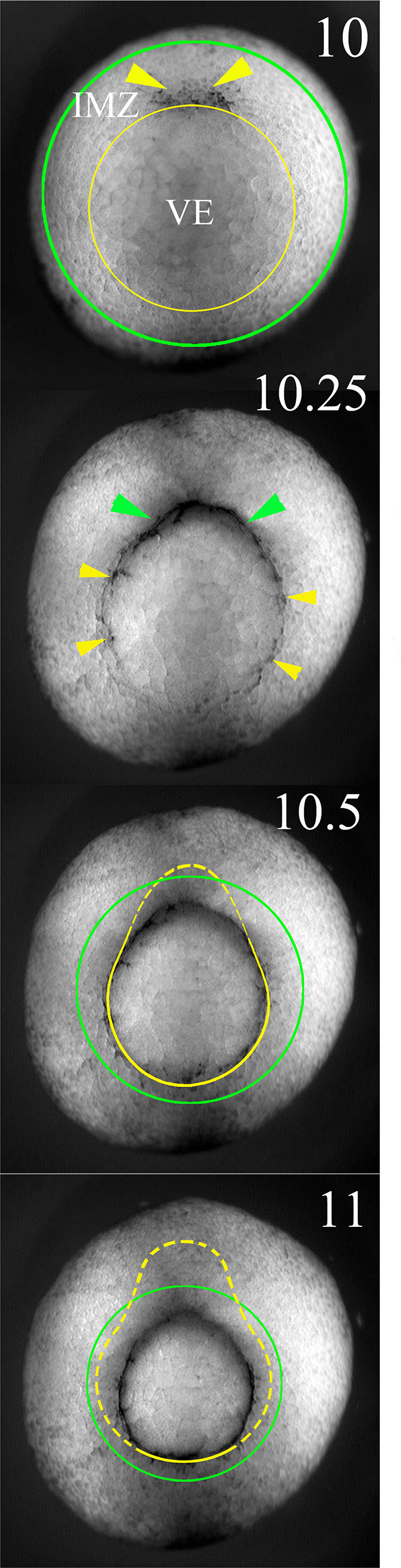 Figure 6—figure supplement 1. The lower (vegetal) and upper (animal) limits of the IMZ are indicated by yellow and green lines superimposed on to vegetal views of a Xenopus gastrula stage embryo at the indicated Nieuwkoop and Faber stages (Nieuwkoop and Faber, 1967).Formation of the blastoporal pigment line, which defines the vegetal end of the IMZ, and initially defines the blastopore, is indicated by yellow pointers, and formation of a depression, the initiation of involution (and an invagination) of the IMZ is indicated by green pointers. Note that the vegetal boundary of the IMZ is carried inside (dashed yellow lines) and covered over by the blastoporal lips from dorsal to ventral as gastrulation proceeds; as this occurs, the lips define the blastopore. |