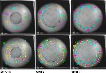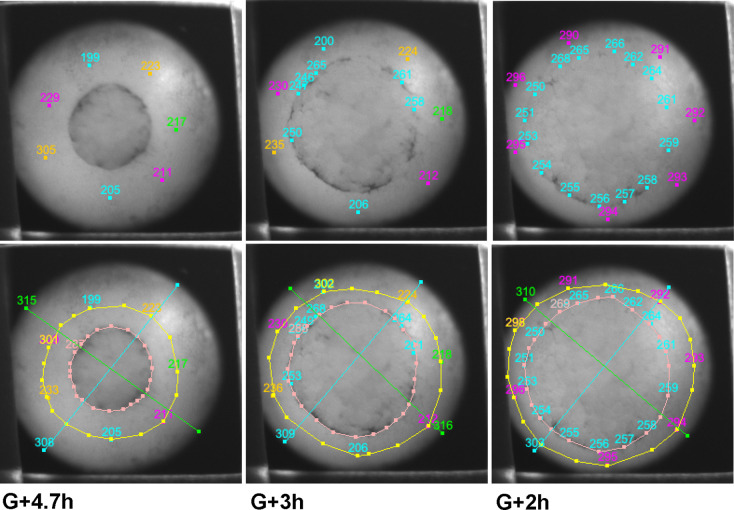 Figure 6-Figure Supplement 2. Examples of tracking of IMZ and blastopore area through the course of a time lapse movie using fiduciary points. Points initially laying at the blastopore lip at late time points (~G + 8 h) are tracked backward to early gastrula stages (top row, outer points). Once bottle cells apices are revealed, the vegetal edge of the bottle field is also tracked backwards (top row, inner circle of blue points). At each time point, the blastoporal area (or prospective blastoporal area, at earlier stages) is determined (area inside pink line), as is the area inside the upper boundary of the IMZ (yellow line â a bit below the actual limit of involution). Areas are determined based on the spherical area of the embryo occupied by each region (see Materials and methods). IMZ area is determined as the area inside the upper IMZ boundary minus the blastoporal area ( = area inside the lower IMZ boundary). Areas are normalized to starting area for each embryo. The embryo shown is a ventralized embryo. |