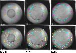 Figure 6—figure supplement 2. Examples of tracking of IMZ and blastopore area through the course of a time lapse movie using fiduciary points.Points initially laying at the blastopore lip at late time points (~G + 8 h) are tracked backward to early gastrula stages (top row, outer points). Once bottle cells apices are revealed, the vegetal edge of the bottle field is also tracked backwards (top row, inner circle of blue points). At each time point, the blastoporal area (or prospective blastoporal area, at earlier stages) is determined (area inside pink line), as is the area inside the upper boundary of the IMZ (yellow line – a bit below the actual limit of involution). Areas are determined based on the spherical area of the embryo occupied by each region (see Materials and methods). IMZ area is determined as the area inside the upper IMZ boundary minus the blastoporal area ( = area inside the lower IMZ boundary). Areas are normalized to starting area for each embryo. The embryo shown is a ventralized embryo. |