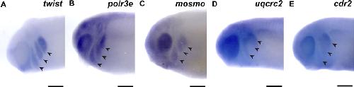 FIGURE 1. 16p12.1-affected genes are expressed in migrating neural crest cells during embryonic development. (A) Lateral view of whole-mount in situ hybridization at stage 25 for twist, a NCC-enriched transcription factor. Anterior of embryo is to left. Arrows indicate the pharyngeal arches (PAs). (BâE) In situ hybridization at stage 25â28 for polr3e, mosmo, uqcrc2, and cdr2 demonstrate expression in NCCs that occupy the PAs (n = 10 per probe). Scalebar = 300 μm. |