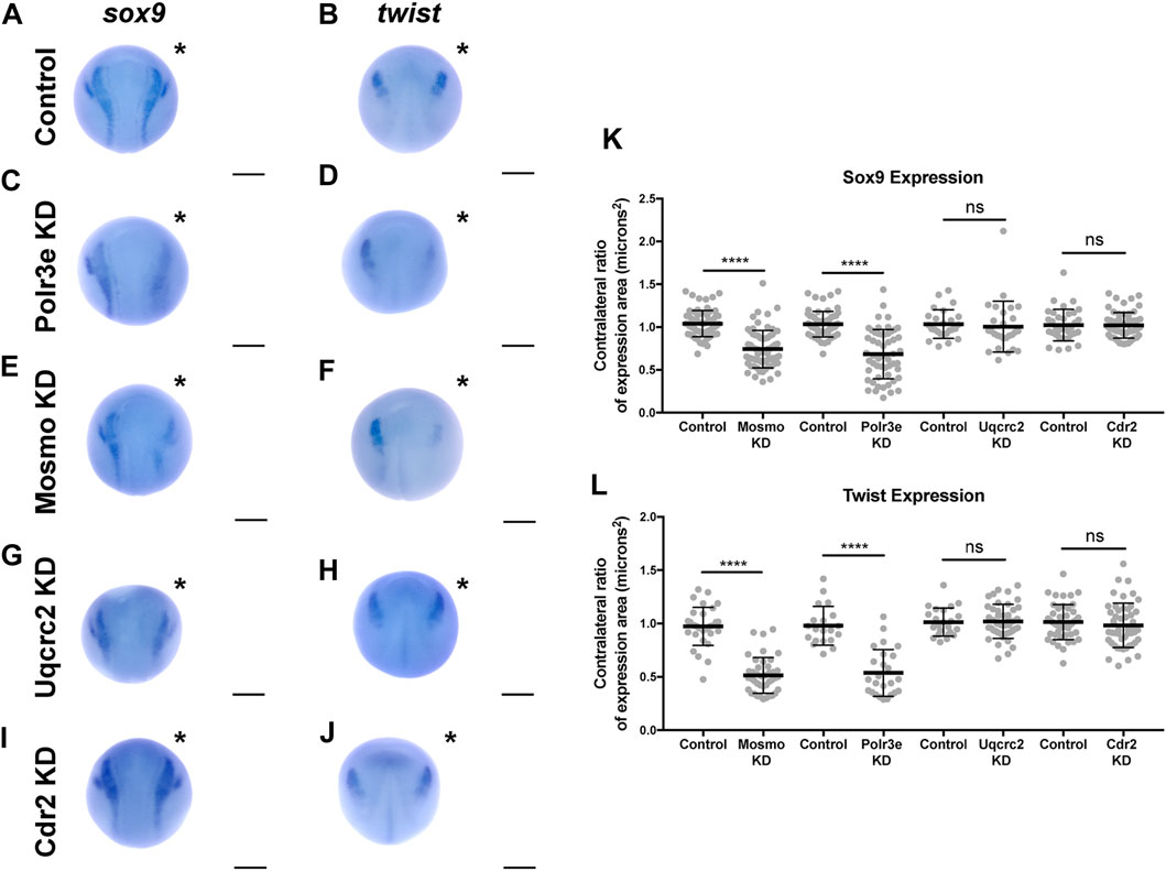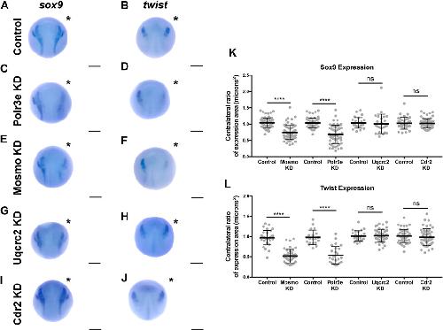 FIGURE 6. Manipulation of Polr3e and Mosmo affects NCC specification In situ hybridization utilized (A,C,E,G,I) antisense mRNA probe against sox9 and (B,D,F,H,J) antisense mRNA probe against twist. Each column of panels are dorsal views of two sides of the same embryo. Embryos were unilaterally injected to KD each individual 16p12.1-affected gene in half of the embryo and the other half was left uninjected. The left side represents the uninjected side and the right side, indicated with an asterisk (*), represents the injected side. Anterior of embryo is at the top. (KâL) Measurements were taken for the total area of the expression pattern for either sox9 (K) or twist (L) using the polygon tool in ImageJ by taking ratios of the injected side versus the uninjected side. Significance was determined using an unpaired students t-test with these ratios. Partial depletion of either Mosmo or Polr3e significantly reduced the total area of expression for both sox9 and twist, while partial depletion of either Uqcrc2 or Cdr2 did not significantly affect the total area of expression for either NCC specification marker. (Embryos quantified with sox9 probe: Control for Polr3e = 60, Control for Mosmo = 66, Control for Uqcrc2 = 25, Control for Cdr2 = 36, Polr3e KD = 55, Mosmo KD = 69, Uqcrc2 KD = 27, Cdr2 KD = 59. Embryos quantified with twist probe: Control for Polr3e = 20, Control for Mosmo = 33, Control for Uqcrc2 = 23, Control for Cdr2 = 46, Polr3e KD = 25, Mosmo KD = 41, Uqcrc2 KD = 44, Cdr2 KD = 50). ****p < 0.0001, ***p < 0.001, **p < 0.01, *p < 0.05, n.s., not significant. Scalebar = 300 μm. |