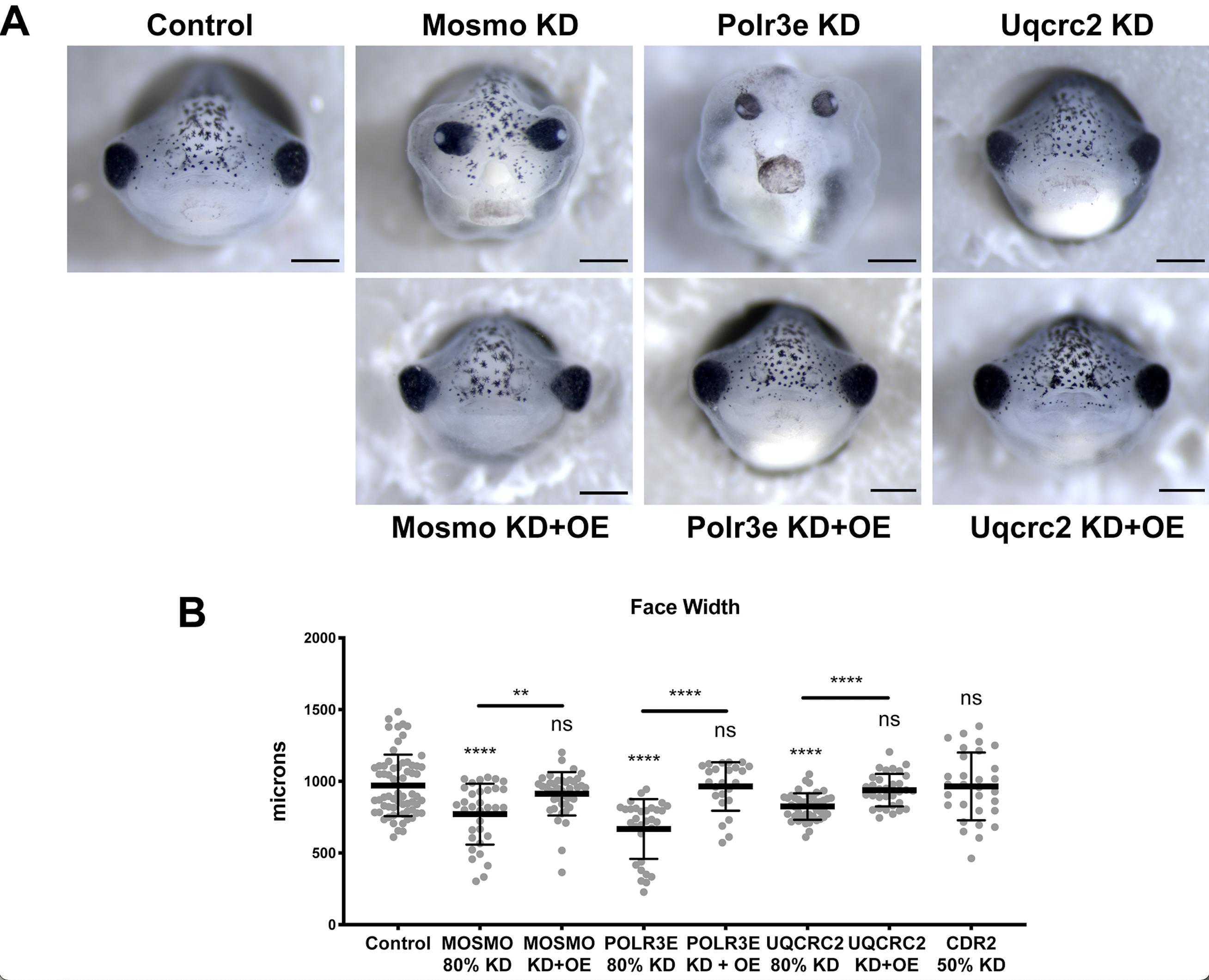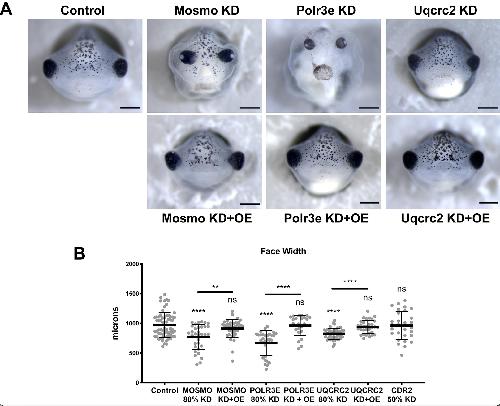 Figure S2. Craniofacial defects caused by 16p12.1-associated gene KD are rescued by co- injection of exogenous mRNA co-expression. (A) Row 1: Representative frontal view images of st. 42 tadpoles injected with control MO or MOs for 16p12.1 homologs show defects in craniofacial features, including a decrease in facial width compared to the control. Row 2: Representative frontal view images of st. 42 tadpoles show facial width defects were rescued with co-injection and overexpression of mRNA for each 16p12.1 gene homolog, respectively. (B) Boxplot representing the quantification and comparison of facial width measurements with knockdown and overexpression of mRNA of individual 16p12.1 gene homologs normalized to controls. Significance determined using a studentâs unpaired t-test. (Embryos quantified: Control = 65, Polr3e KD = 31, Polr3e KD+OE = 24, Mosmo KD = 33, Mosmo KD+OE = 42, Uqcrc2 KD = 44, Uqcrc2 KD+OE = 32, Cdr2 KD = 30). ****p < 0.0001, ***p < 0.001, **p < 0.01, *p < 0.05, n.s., not significant. Scalebar = 500μm. |