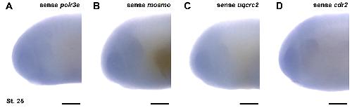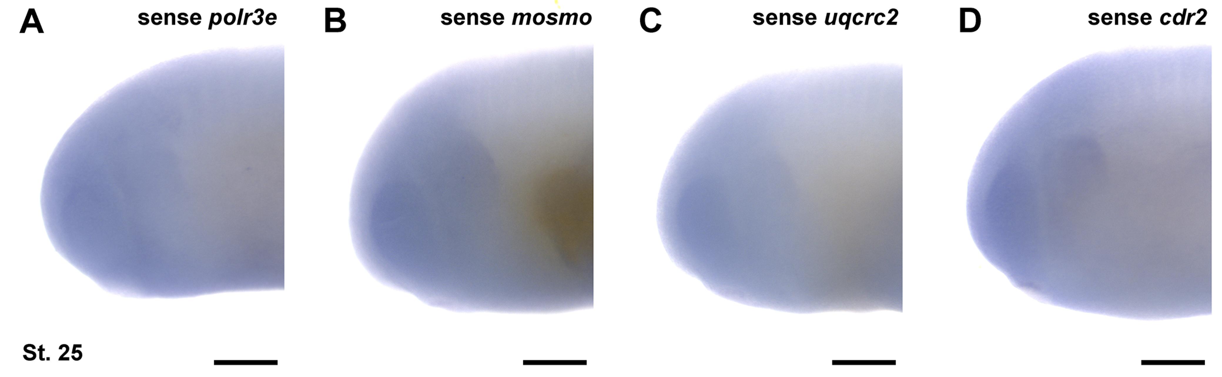 Figure S4: In situ hybridization probes generated against sense strands of 16p12.1-affected gene mRNAs. In situ hybridization utilized (A) sense mRNA probe against polr3e, (B) sense mRNA probe against mosmo, (C) sense mRNA probe against uqcrc2, and (D) sense mRNA probe against cdr2, shown at stage 25. (n = 10 per probe). Scalebar = 300μm. |