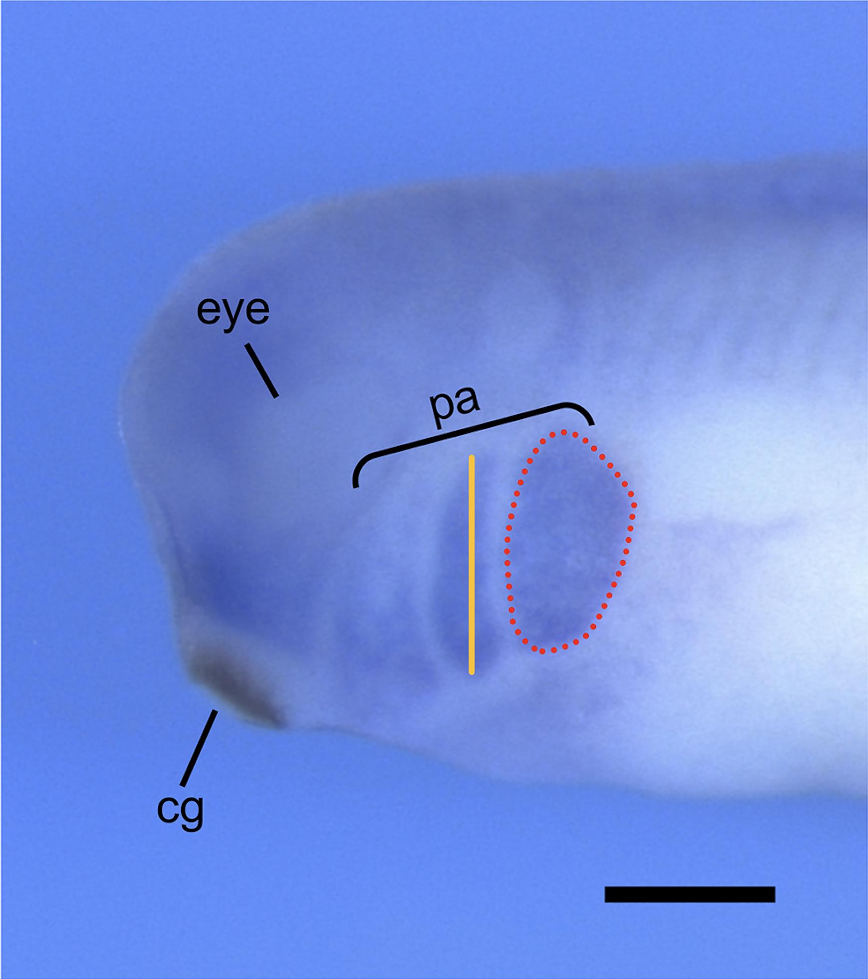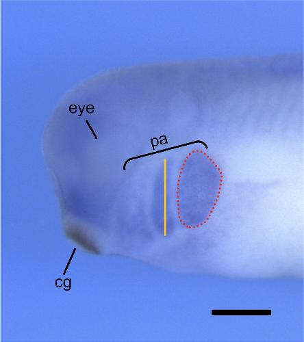 Figure S5: Representative image of stage 28 X. laevis embryo labeled for twist, a transcription factor that is critical for NCC specification and enriched in the pharyngeal arches. Measurements of the length (orange line) and area (red dotted line) of each individual pharyngeal arch can be done using ImageJ. cg, cement gland; pa, pharyngeal arch. Scale bar = 500μm. |