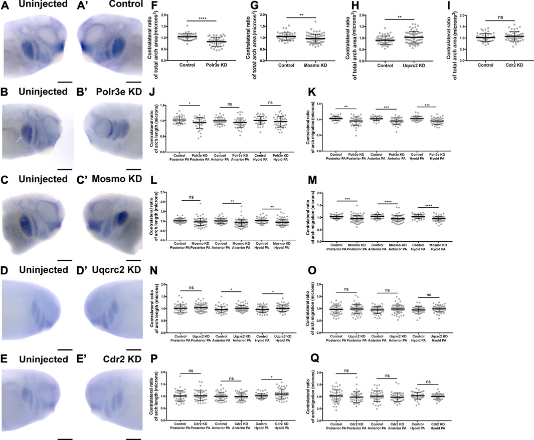FIGURE 3. Knockdown of Polr3e and Mosmo affect CNC migration in vivo. (AâC, Aâ²âC) (AâE, Aâ²âEâ²) Lateral views of stage 25 embryos following whole-mount in situ hybridization against twist. Each column of panels are lateral views of two sides of the same embryo. Embryos were unilaterally injected to KD each individual 16p12.1-affected gene in half of the embryo and the other half was left uninjected. The left panels (AâE) represent the uninjected side and the right panels (Aâ²âEâ²) represent the injected side. (FâQ) Measurements were taken for the total area of the three PAs (posterior PA, anterior PA, and hyoid PA), the length of each individual arch, and the NCC migration distance, as measured from the dorsal-most tip of each arch to the neural tube, by taking ratios of the injected side versus the uninjected side. Significance was determined using an unpaired students t-test with these ratios. (FâH) Partial depletion of both Polr3e and Mosmo significantly reduced the total area of the three PAs, while partial depletion of Uqcrc2 slightly increased the total area of the three PAs. (JâK) Polr3e KD significantly reduced the length of the posterior PA but had no effect on the length of the anterior PA or hyoid PA. However, partial depletion of this gene significantly reduced the total NCC migration distances for all three PAs. (LâM) Mosmo KD significantly reduced the length of the anterior PA and hyoid PA but had no effect on the length of the posterior PA. Partial depletion of this gene also significantly reduced the total NCC migration distance for all three PAs. (NâO) Uqcrc2 KD slightly increased the length of the anterior and hyoid PA but had no effect on the length of the posterior PA, nor did it affect the total NCC migration distance. (I, PâQ) Cdr2 KD had no effect on the total area of the three PAs, nor did it affect the total NCC migration distance. However, partial depletion of this gene slightly increased the length of the hyoid PA but did not affect the posterior or anterior PAs. (Embryos quantified: Control for Polr3e = 35, Control for Mosmo = 48, Control for Uqcrc2 = 48, Control for Cdr2 = 45, Polr3e KD = 41, Mosmo KD = 75, Uqcrc2 KD = 68, Cdr2 KD = 45). ****p < 0.0001, ***p < 0.001, **p < 0.01, *p < 0.05, n.s., not significant. Scalebar = 300 μm. |