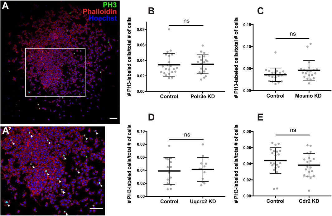 FIGURE 5. Manipulation of 16p12.1-affected genes does not impact NCC proliferation in vitro. Dissected NCC explants from control, Polr3e KD, Mosmo KD, Uqcrc2 KD, and Cdr2 KD embryos were plated on fibronectin-coated coverslips, allowed to adhere and begin migration for 4 h before being fixed in 4% PFA and immunostained with PH3 antibody as a marker for NCC proliferation, phalloidin to label the actin cytoskeleton, and Hoechst to label nuclei. (A,Aâ²) Representative image of control NCC explant immunostained with PH3, phalloidin, and Hoechst. White arrows denote cells positively labeled for PH3. (BâE) Quantification of the number of positively PH3-labeled cells versus the total number of cells per NCC explant for Polr3e KD, Mosmo KD, Uqcrc2 KD, and Cdr2 KD compared to controls. Partial depletion of each individual 16p12.1-affected did not have a significant impact on NCC proliferation in vitro. (Explants quantified: 6-7 explants from control and KD embryos were plated for each experiment. Three separate experiments were performed for each depletion). ****p < 0.0001, ***p < 0.001, **p < 0.01, *p < 0.05, n.s., not significant. Scalebar = 300 μm. |