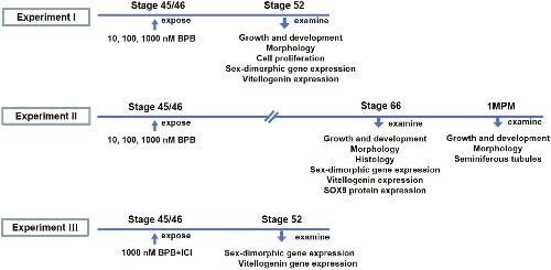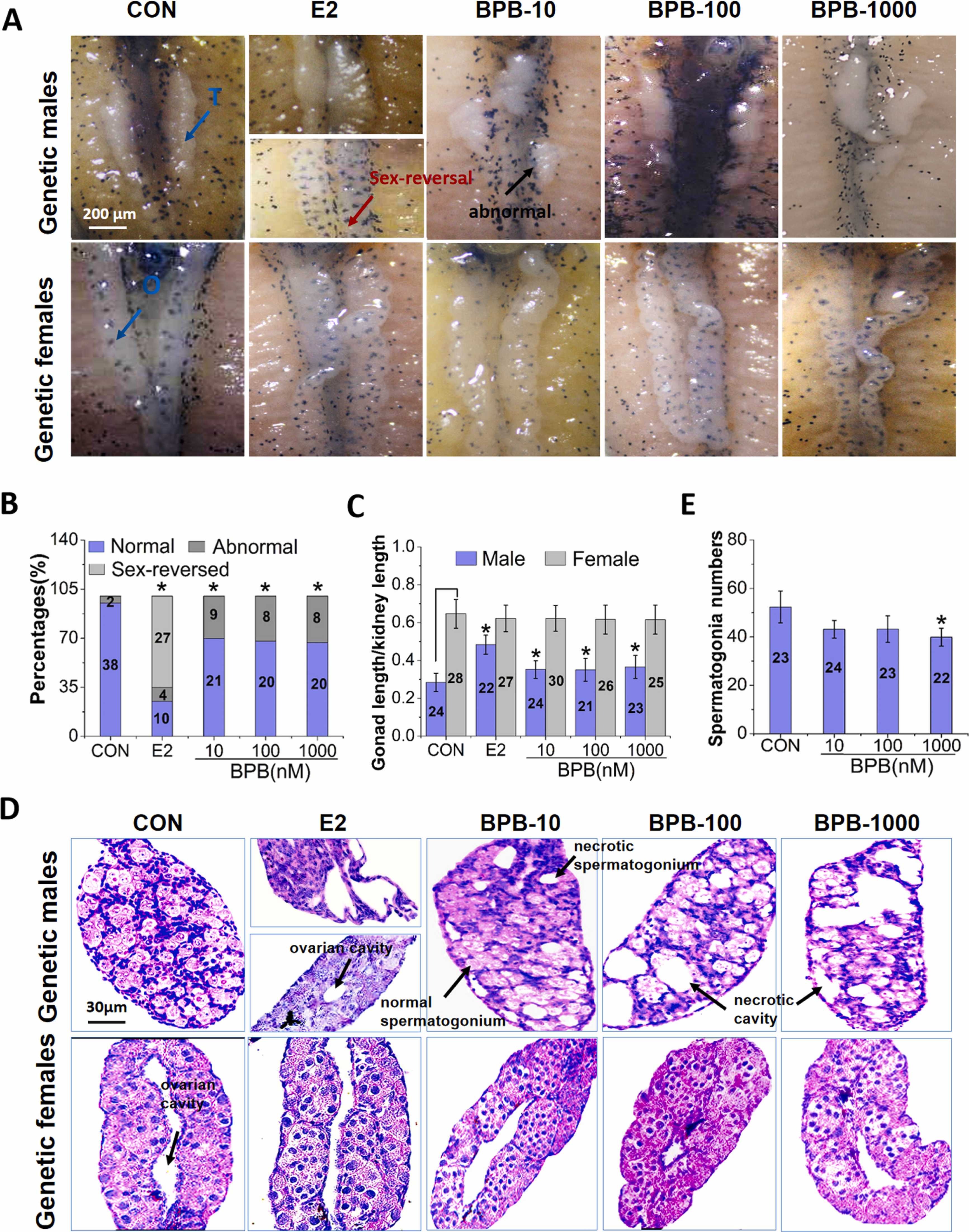 Fig. 3. Gross gonadal morphological (A, B, C) and histological (D, E) changes in Xenopus laevis following exposure to bisphenol B (BPB) or 17ß-estradiol (E2) from stages 45/46–66. The results were from one of independent experiments repeated twice with three replicated aquariums (n = 3). Genetic sex was identified by genetic sex identification. The values in bar chart represent the numbers of X. laevis examined. Data are showed as mean ± SD. * indicates a significant difference compared with the control group (p < 0.05).
