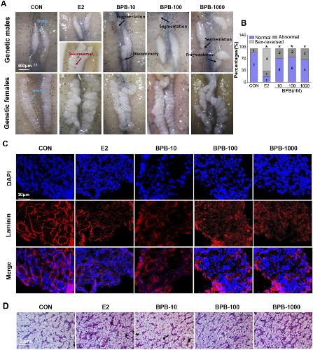 Fig. 5. Effects of bisphenol B (BPB) or 17ß-estradiol (E2) on gross gonadal morphology (A, B), seminiferous tubule formation (C), and hepatohistology (D) in Xenopus laevis following exposure from stages 45/46–1 month post-metamorphosis. Six tadpoles per group for seminiferous tubules by Laminin 1 Immuno-fluorescence staining. * indicates a significant difference compared with the control group (p < 0.05).