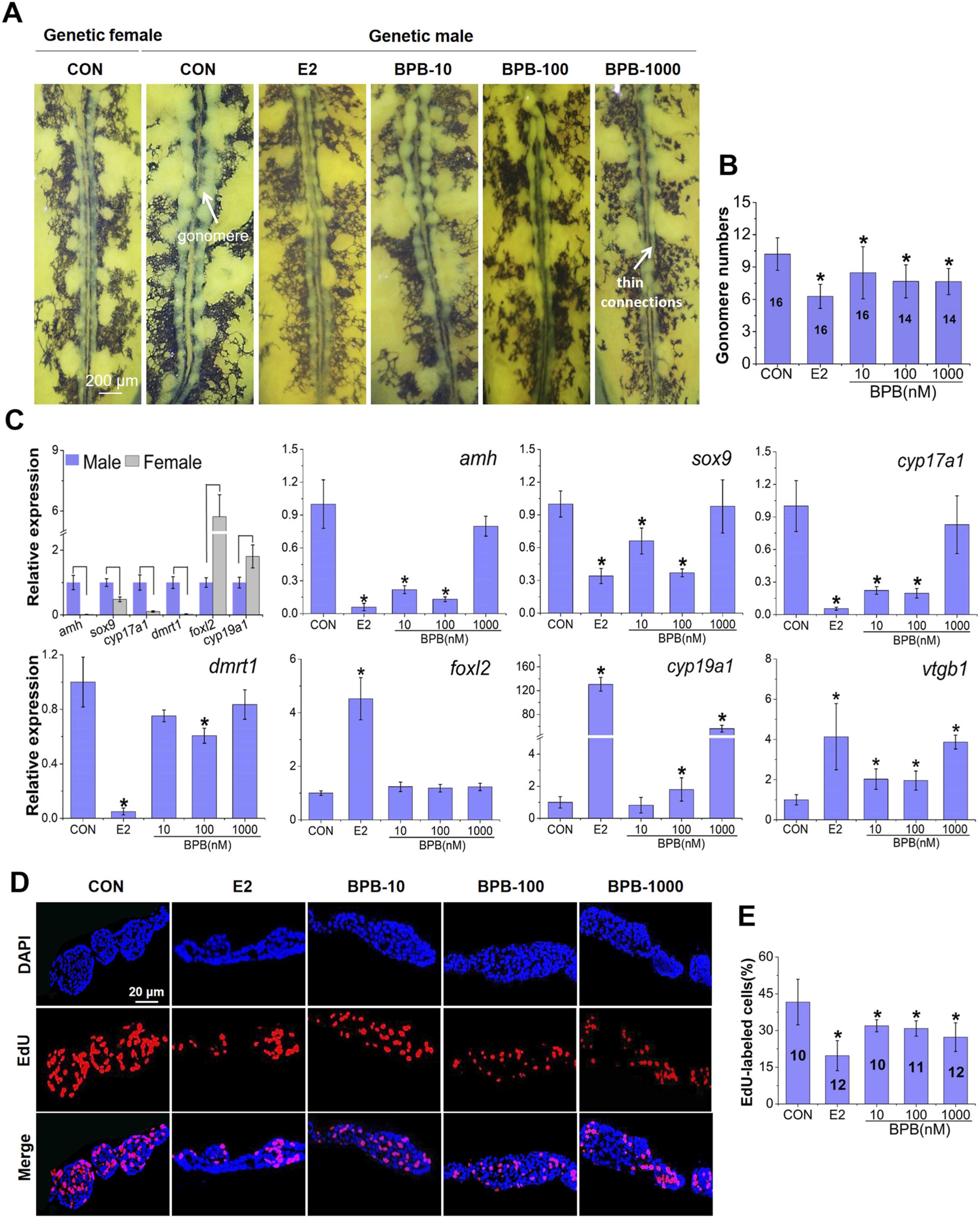 Fig. 2. Changes in gross gonadal morphology (A), the number of gonomeres in each testis (B), the relative expression of sex-dimorphic genes in gonad-mesonephros complexes (C), EdU-labeled proliferating cells in testes (D, E) of Xenopus laevis following exposure to bisphenol B (BPB) or estradiol (E2) from stages 45/46â52. The experiment was repeated three times using tadpoles from different sets of adults with similar results, and we show the results from one independent experiment. Data on cell proliferation are based on all observations from all sagittal sections (five or six) for each gonad. Data are shown as mean ±âSD (the aquarium as the statistical unit, nâ=â3). The values in column represent the number of animals. * indicates a significant difference between BPB treatment and controls (pâ<â0.05). Ligature represents a significant difference between the control males and females (two-tailed independent-sample t test, pâ<â0.05).