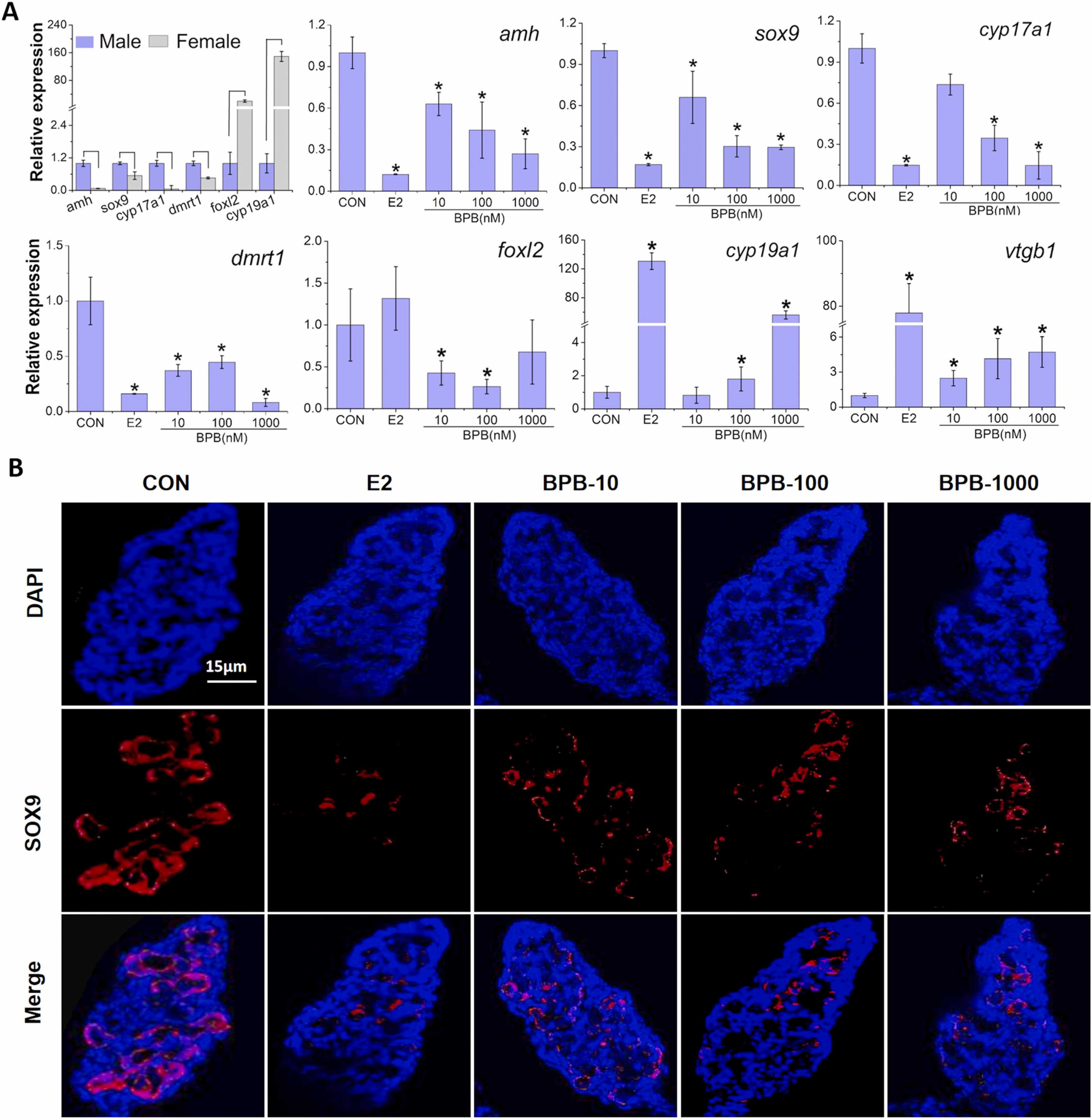 Fig. 4. Changes in relative expression of sex-dimorphic genes in gonad-mesonephros complexes (A) and Sox 9 protein (B) in testes of Xenopus laevis following exposure to bisphenol B (BPB) or 17Ã-estradiol (E2) from stages 45/46â66. Data are shown as mean ±âSD (the aquarium as the statistical unit, nâ=â3). *âindicates a significant difference compared with the control group (pâ<â0.05). Ligature represents a significant difference between the control males and females (two-tailed independent-sample t test, pâ<â0.05). Gonads were cut at cross section at 10âµm.
