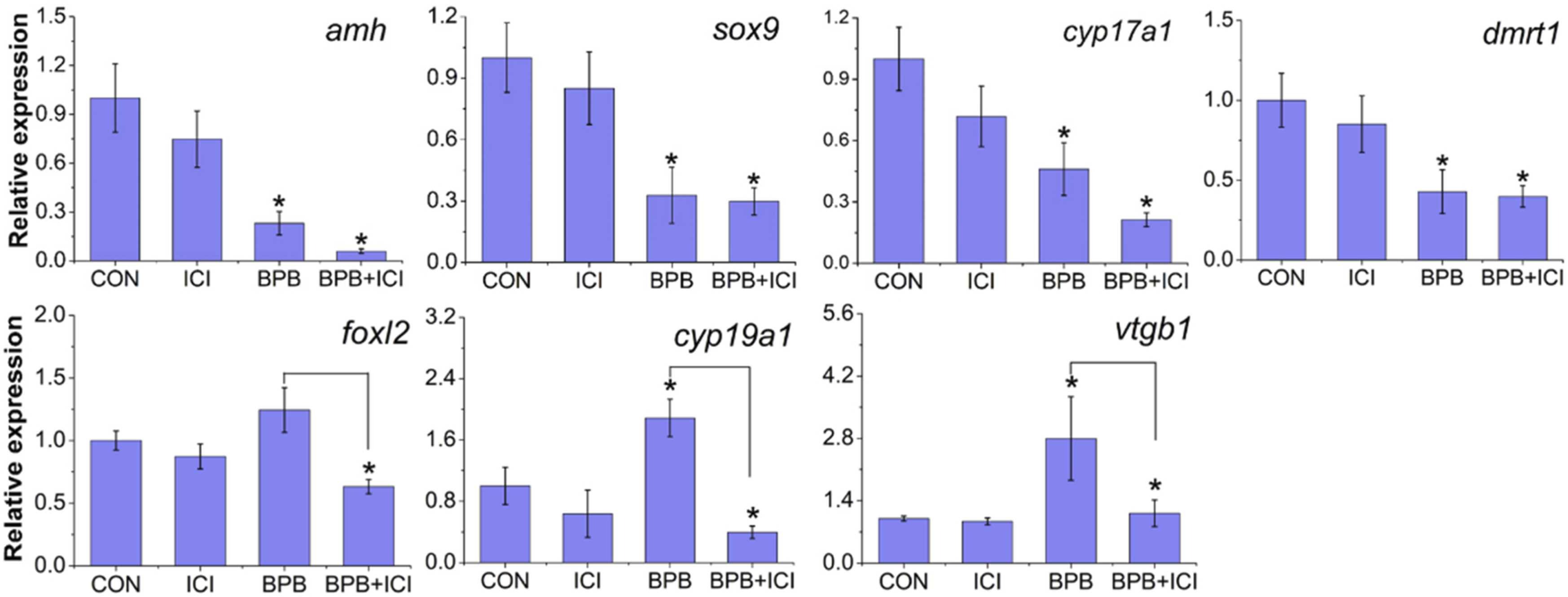 Fig. 6. Changes in relative expression of sex-dimorphic genes in gonad-mesonephros complexes of Xenopus laevis following exposure to bisphenol B (BPB) or ICI 182780 or their combination from stages 45/46â52. *âindicates a significant difference compared with the control group (pâ<â0.05). Ligatures represents a significant difference between the control males and females (pâ<â0.05).
