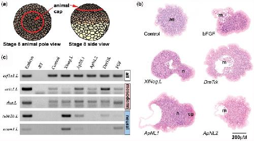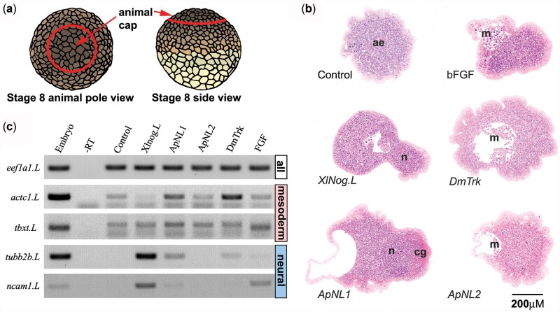 ApNL1 and ApNL2 induce mesoderm in Xenopus animal caps. a) Schematic of animal cap explants. b) Representative sections of resin-embedded sections of Polychrome stained animal cap explants. Controls were injected with dH2O. Basic FGF (bFGF) protein was used as a positive control for MAPK activity. ae, atypical epidermis; n, neural; cg, cement gland (neural), m, mesenchyme (ventral mesoderm). Scale bar 200 µm. c) RT-PCR of mesodermal (actc1.L and tbxt. L) and neural (tubb2b.L and ncam1.L) markers. The negative control is genomic RNA from Xenopus embryo without Reverse Transcriptase (RT) enzyme. Ubiquitously expressed elongation factor 1-α (eef1a1.L) is the loading control.