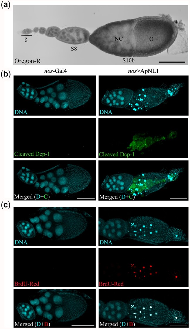 Fig. 4. Maternal expression of ApNL1 triggers apoptosis during Drosophila oogenesis. a) A single ovariole of wild-type Oregon-R fly strain. g, germarium; NC, nurse cells; O, oocyte. b) Immunostaining for cleaved Drosophila death caspase 1 (Dcp-1) during late Drosophila oogenesis of nos-Gal4 and nos>ApNL1 female flies. DAPI—cyan, cleaved Dcp-1—green. c) TUNEL assay with BrdU-Red for late stages of Drosophila oogenesis of nos-Gal4 and nos>ApNL1 female flies. Scale bar 100 µm.