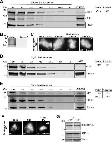 Figure 1-Figure Supplement 1: Immunodepletions and the effects of RNases and various transcription inhibitors on chromosome condensation and cell cycle state. (A) Western blot for CAP-E, XPB, and Tubulin in Mock or CAP-E depleted extracts. Dilution series of Mock-depleted extracts was used to calculate the % depletion of CAP-E using quantitative fluorescence. (B) 1% agarose gel stained with SYBR safe stain showing RNase A dependent removal of total RNAs from high-speed supernatant egg extracts. (C) Representative fluorescence images of chromatid assembly at steady state (180 min after sperm addition) in the presence of indicated buffers and enzymes. See Materials and methods for details. Note that the high salt in the RNase H buffer causes morphological changes to chromatids regardless of activity. Mean condensation parameters for each condition are indicated in lower left corner of each image. (D) Western blot for XPB and Tubulin in IgG or XPB-depleted extracts. Dilution series of IgG-depleted extracts was used to calculate the % depletion of XPB using quantitative fluorescence. (E) Western blot for XPF, ERCC1, and Tubulin in IgG or ERCC1-depleted extracts. Dilution series of IgG-depleted extracts was used to calculate the % depletion of ERCC1 and XPF using quantitative fluorescence. (F) Representative fluorescence images of chromatid assembly at steady state (180 min after sperm addition) in the presence of DMSO, 30 μM CDK7 inhibitor THZ1, or 30 μM THZ1 and 50 μM triptolide (TPL). (G) Triptolide does not affect CDK1 activation or maintenance of M phase. Western blot for CDK1 T161ph, histone H3T3ph, and Tubulin in M phase HSS extracts in the presence of DMSO or 50 μM triptolide. Both CDK1T161ph (a CDK7 substrate) and H3T3ph are only highly phosphorylated in M phase, and their appearance is not affected by triptolide treatment. |