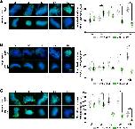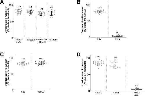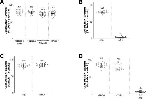Figure 1-Figure Supplement 3: Condensation parameters. (A–D) Scatter plots of the percentage of pixels below a threshold of 35% of image maximum fluorescence intensity (the condensation parameter), for indicated conditions in Figure 1 and Figure 1—figure supplement 1. Error bars represent SD, and the mean values are indicated. n = 20 structures for each condition. Two biological replicates were performed, quantified structures are from a single experiment. |