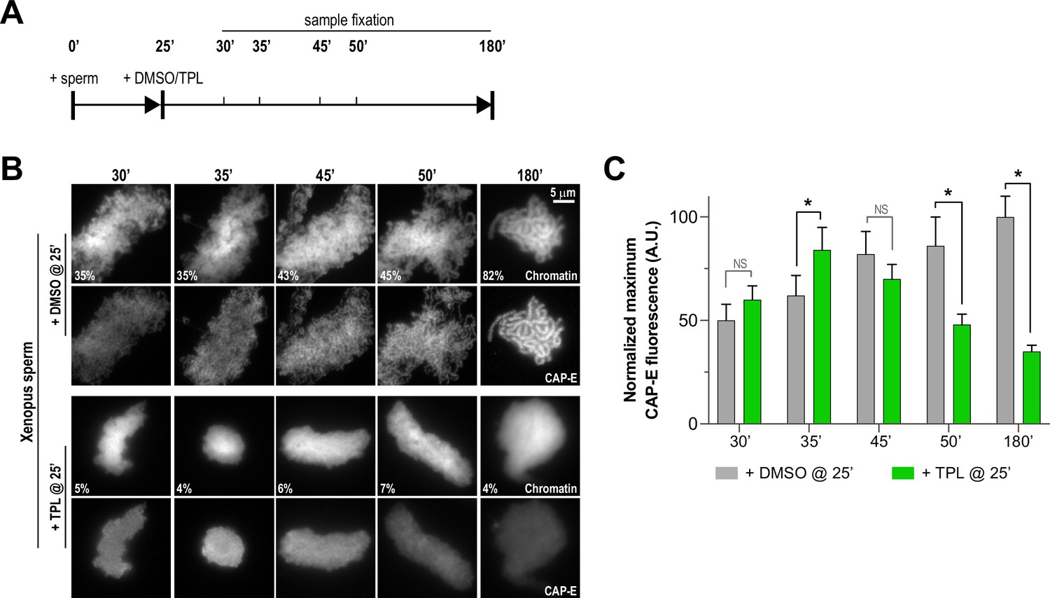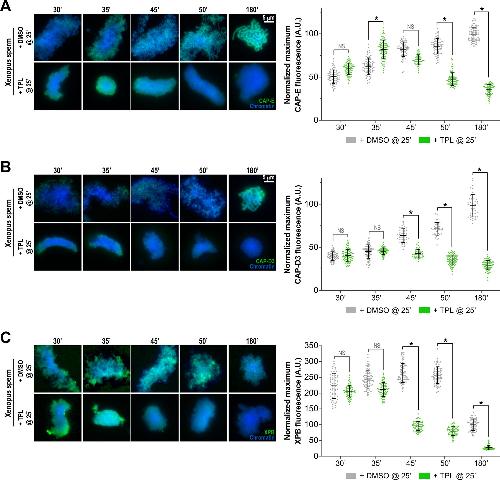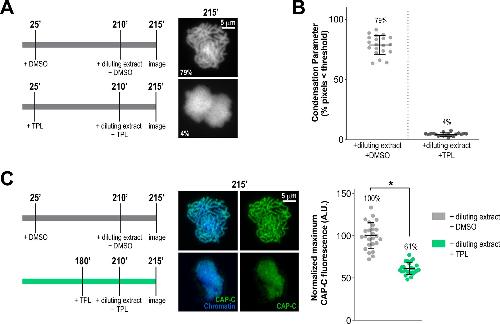 Figure 4. Triptolide perturbs condensation prior to its effects on condensin levels. (A) Schematic of assay to test the timing of triptolide-induced defects in condensation and condensin levels. After a twenty-five minute incubation, either DMSO or triptolide (TPL) was added, and samples were taken at indicated times and processed for immunofluorescence. (B) Representative immunofluorescence images of DMSO or triptolide treated extracts at indicated timepoints. Chromatids were labeled with Hoechst and anti-CAP-E (condensin I and II). Note that condensation is already lost in in the first timepoint after triptolide addition, as in Figure 2A. Mean condensation parameters for each condition are indicated in lower left corner of each image. (C) Quantification of fluorescence intensity of CAP-E from experiment in (B), normalized to the 180 min DMSO-treated sample. n = 50 structures for each condition. Error bars represent SD, and asterisks indicate a statistically significant difference (*, p < 0.001). A.U., arbitrary units. Two biological replicates were performed, quantified structures are from a single experiment. |