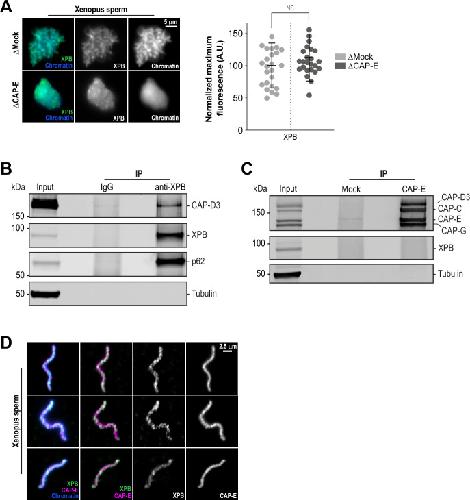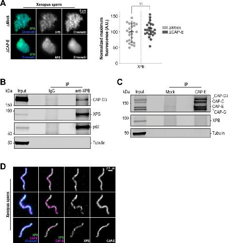 Figure 3—figure supplement 1 The TFIIH complex is required for the enrichment of condensins on chromosomes. (A) Left: Representative immunofluorescence images of Xenopus sperm nuclei incubated with Mock or CAP-E depleted extracts for 180 min. Chromatids were labeled with Hoechst and anti-XPB antibodies. Right: Quantification of fluorescence intensity of XPB on chromatin, normalized to Mock depleted condition. n = 24 structures for each condition. Error bars represent SD, and ‘NS’ indicates no statistically significant difference (p > 0.001). A.U., arbitrary units. Two biological replicates were performed, quantified structures are from a single experiment. (B) Western blot for indicated proteins that copurify with anti-XPB or IgG beads isolated from HSS extracts. IP, immunoprecipitate. (C) Western blot for indicated proteins that copurify with anti-CAP-E or Mock-treated beads isolated from HSS extracts. For condensin subunit detection, the blot was probed simultaneously with the indicated antibodies. Beads were coupled to either anti-CAP-E or pre-immune serum (“Mock”) and processed as indicated in the methods. IP, immunoprecipitate. (D) Representative immunofluorescence images of Xenopus sperm nuclei incubated with HSS extracts for 180 min. Chromatids were labeled with Hoechst and co-stained with anti-XPB and anti-CAP-E antibodies. Images of three representative individual chromatids are shown. |