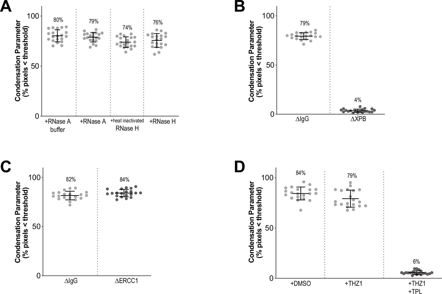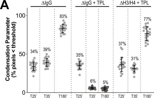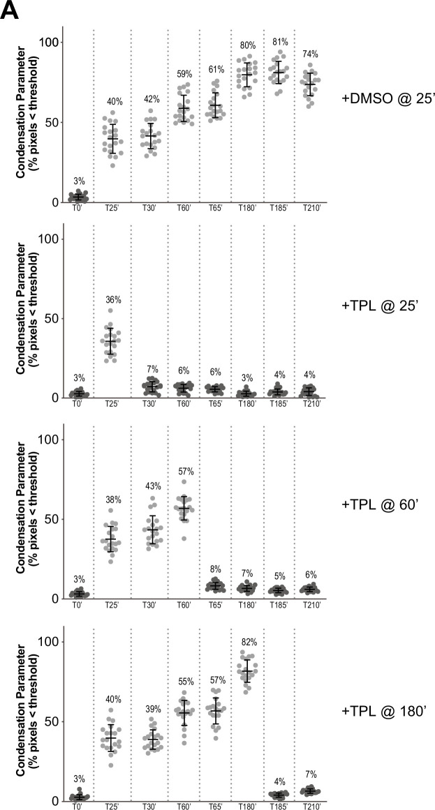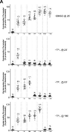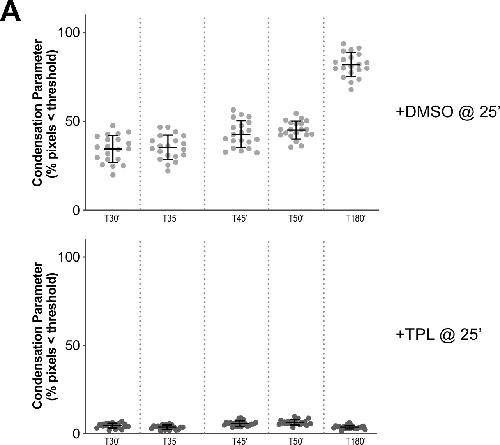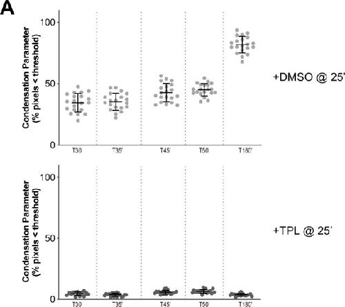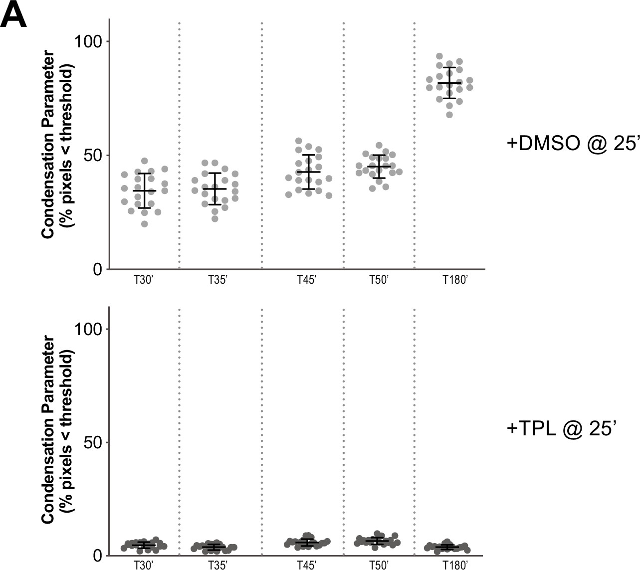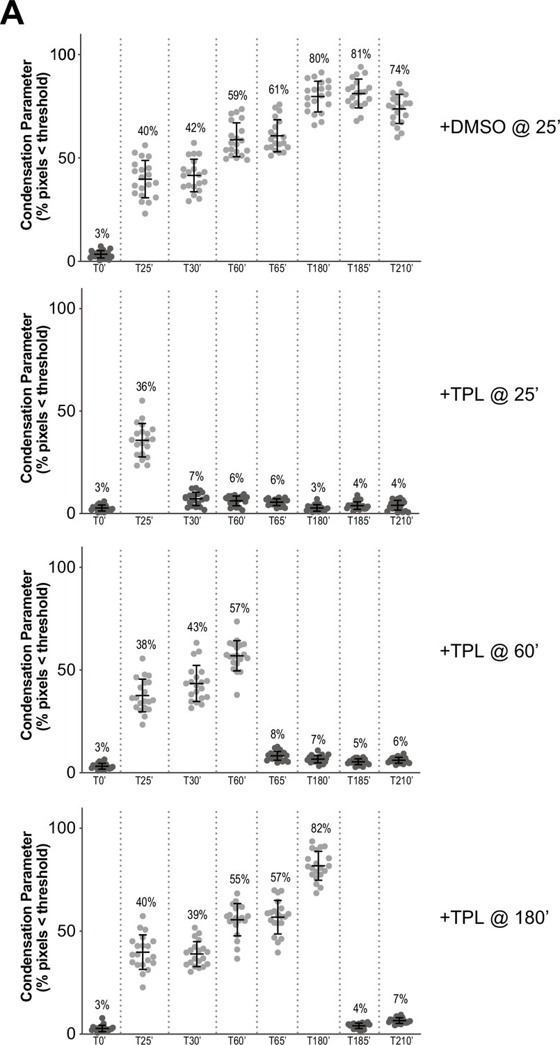 Figure 4—figure supplement 1 Condensation parameters of condensation kinetics after DMSO or Triptolide treatment. (A) Scatter plots of the percentage of pixels below a threshold of 35% of image maximum fluorescence intensity (the condensation parameter), for each drug condition and indicated time point. Error bars represent SD, and the mean values are indicated. n = 20 structures for each condition. Two biological replicates were performed, quantified structures are from a single experiment. |