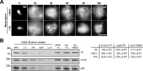 Figure 5—figure supplement 1 Effects of triptolide and histone depletion on condensation using mouse sperm. (A) Representative fluorescence images of chromatid assembly at steady state with mouse sperm nuclei in egg extracts (180 min after sperm nuclei addition) in the presence of indicated inhibitors. Triptolide or DMSO control was added at 25 min after nuclei addition. Triptolide was added at 50 μM. (B) Western blot for histone H3, CAP-E, and XPB in histone H4K12ac or IgG-depleted extracts in the presence of triptolide (TPL) or DMSO. Relative percentage of protein remaining after indicated treatments is shown. |