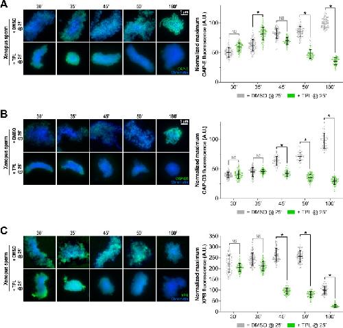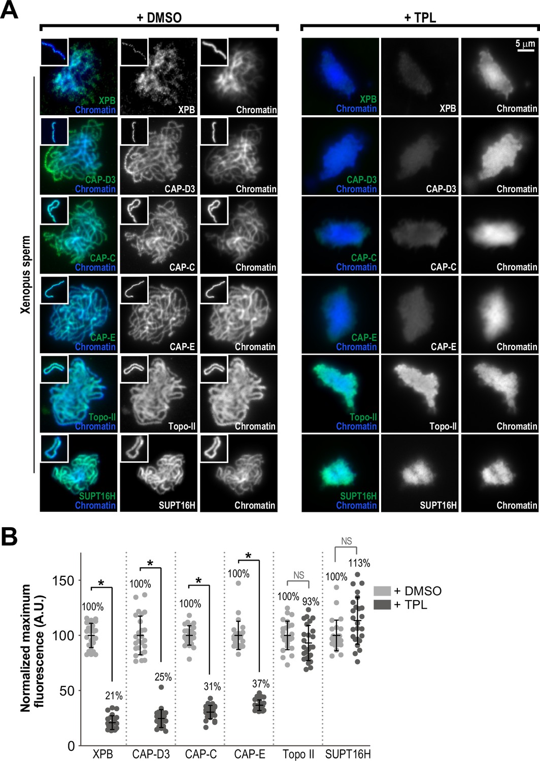 Figure 4—figure supplement 2. Triptolide perturbs condensation prior to its effects on condensin levels.(A) Left: Representative immunofluorescence images of DMSO or triptolide-treated extracts at indicated timepoints. Chromatids were labeled with DAPI and anti-CAP-E (condensin I & II). Right: Quantification of fluorescence intensity of CAP-E, normalized to the 180 min DMSO-treated sample. This data is also shown in Figure 4B in grayscale. (B) Left: Representative immunofluorescence images of DMSO or triptolide treated extracts at indicated timepoints. Chromatids were labeled with DAPI and anti-CAP-D3 (condensin II). Right: Quantification of fluorescence intensity of CAP-D3, normalized to the 180 min DMSO-treated sample. (C) Left: Representative immunofluorescence images of DMSO or triptolide treated extracts at indicated timepoints. Chromatids were labeled with DAPI and anti-XPB (TFIIH complex). Right: Quantification of fluorescence intensity of XPB, normalized to the 180 min DMSO-treated sample. n = 50 structures for each condition. Error bars represent SD, and asterisks indicate a statistically significant difference (*, p < 0.001). A.U., arbitrary units. Two biological replicates were performed, quantified structures are from a single experiment. |