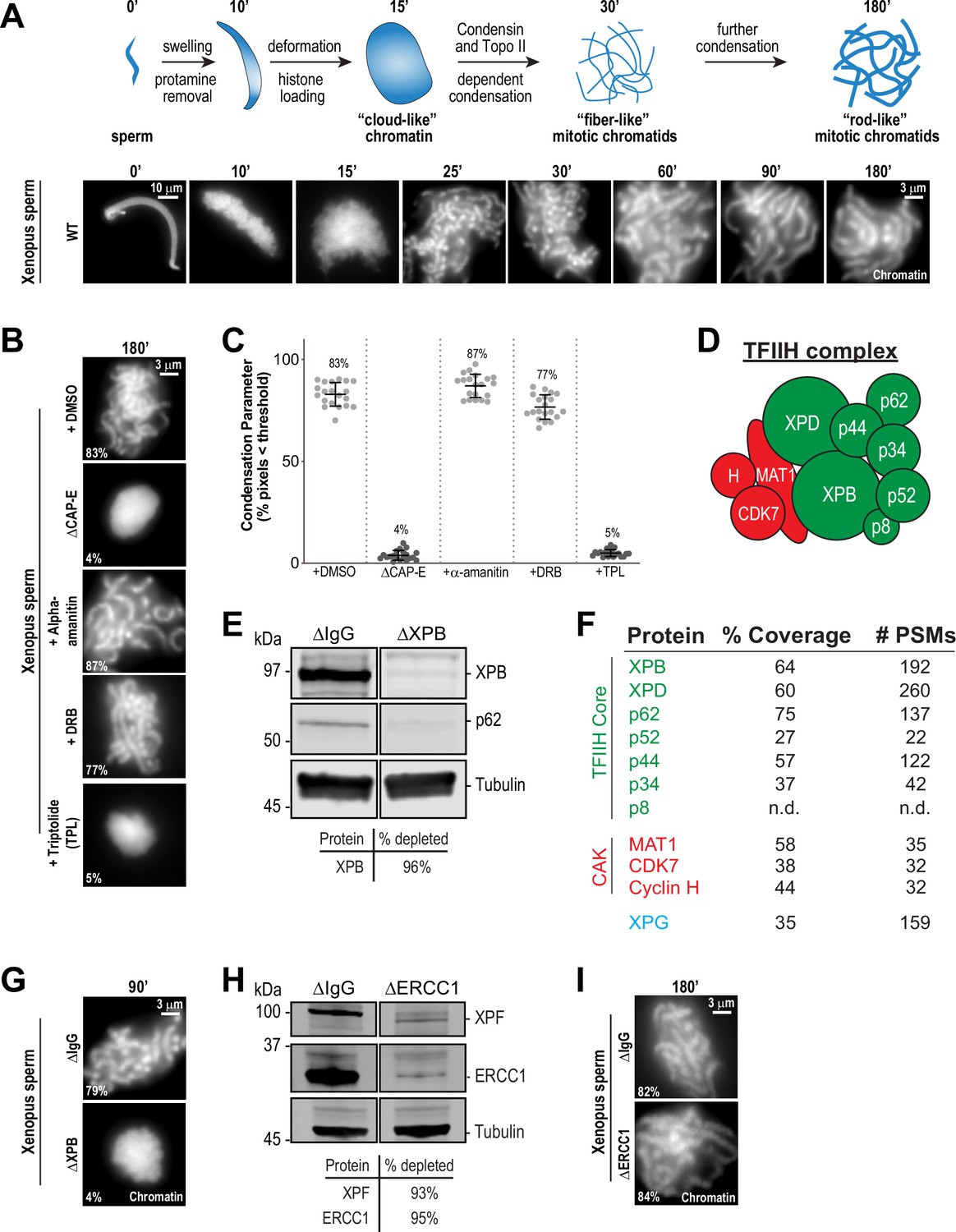 Figure 1. The TFIIH complex is required for chromosome condensation in Xenopus egg extracts. (A) Top: Schematic of chromatid assembly in M-phase high-speed supernatant (HSS) extract. Bottom: Representative fluorescence images of fixed samples from a chromatid assembly reaction taken at indicated timepoints after sperm addition. Chromatin was stained with Hoechst. (B) Representative fluorescence images of chromatid assembly at steady state (180 min after sperm addition) in the presence of indicated inhibitors. Each drug or DMSO control was added at 25 min to exclude effects on the protamine-histone exchange process. Final inhibitor concentrations: Triptolide (50 μM), DRB (100 μM), and a-amanitin (54 μM). See Figure 1âfigure supplement 1A for CAP-E depletion. Mean condensation parameters for each condition are indicated in lower left corner of each image. (C) Scatter plot of the percentage of pixels below a threshold of 35% of image maximum fluorescence intensity (the condensation parameter), which measures the progressive change in the fluorescence intensity distribution that occurs during condensation, for each condition. Error bars represent SD, and the mean values are indicated. n = 20 structures for each condition. Two biological replicates were performed, quantified structures are from a single experiment. (D) Schematic of the TFIIH complex. TFIIH core complex is green, CAK subcomplex in red. (E) Western blot for XPB, p62, and Tubulin in IgG or XPB-depleted extracts. (F) TFIIH complex members that interact with XPB in M-phase HSS extract, as identified by mass spectrometry. Purifications were performed in the absence of chromatin. PSMs = peptide spectrum matches. (G) Representative fluorescence images of chromatid assembly 90 min after sperm addition in IgG or XPB depleted extracts. Chromatin was stained with Hoechst. (H) Western blot for XPF, ERCC1, and Tubulin in IgG or ERCC1-depleted extracts. (I) Representative fluorescence images of chromatid assembly 180 min after sperm addition in IgG or ERCC1-depleted extracts. Chromatin was stained with Hoechst. |