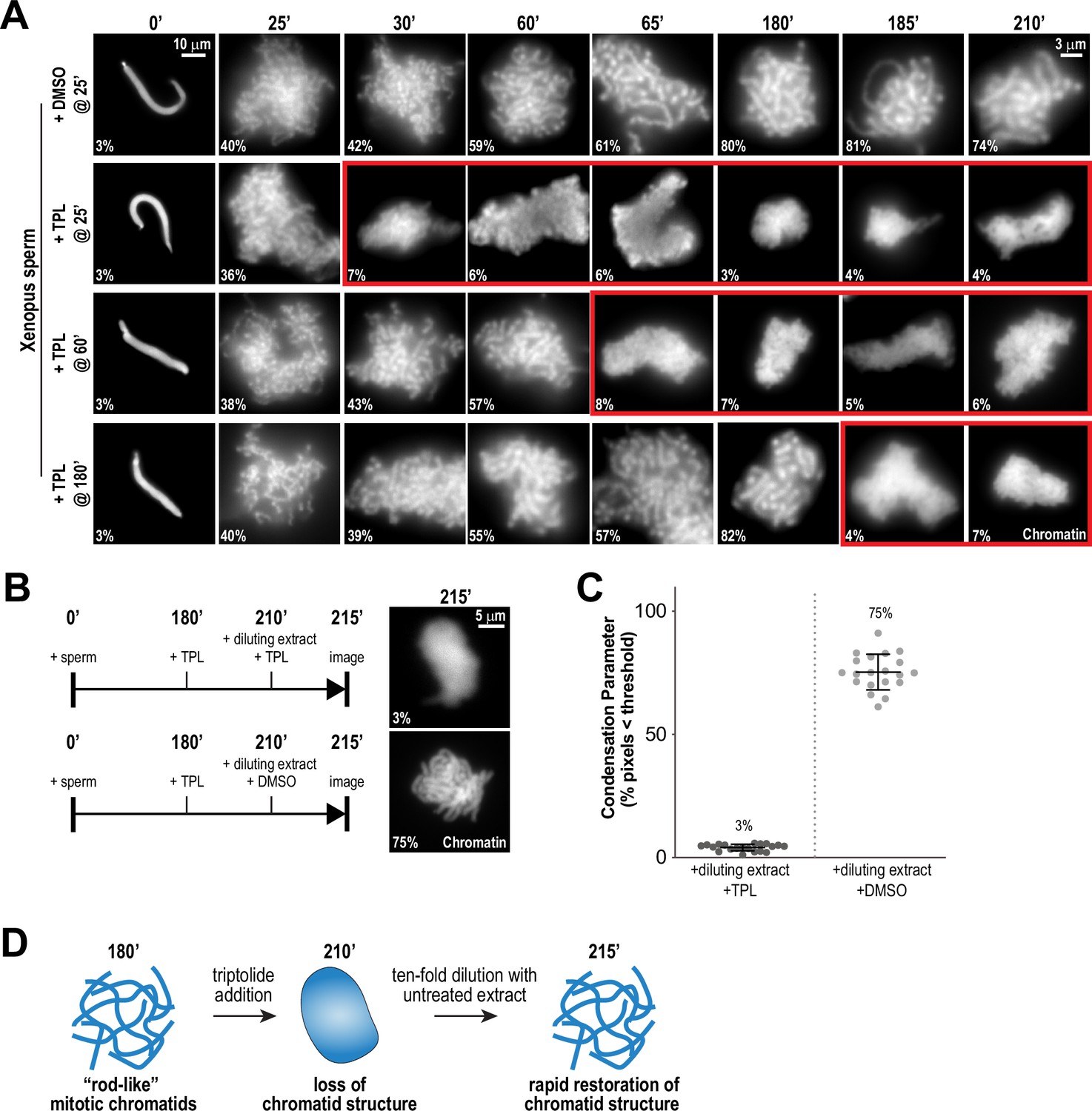Figure 2. Continuous TFIIH activity is required to maintain chromosome structure. (A) Representative fluorescence images of chromatid assembly reactions sampled at indicated timepoints. DMSO or triptolide (TPL) were added at indicated times, immediately after sample retrieval for imaging. Chromatin was stained with Hoechst. Red boxes indicate representative images of decondensed chromosomes after triptolide addition. Mean condensation parameters for each condition are indicated in lower left corner of each image, see Figure 2âfigure supplement 1A for more details. (B) Representative fluorescence images of chromatid masses fixed and spun onto coverslips 215 min after sperm addition, subjected to the indicated manipulations. Nuclei were incubated in extracts for 180 min to allow for the formation of fully condensed chromatids, followed by addition of DMSO or triptolide. After 30 min of incubation with DMSO/triptolide, reactions were diluted 10-fold with extract containing DMSO or triptolide, and further incubated for 5 min before taking samples for imaging. See Figure 2âfigure supplement 2 for additional controls. Chromatin was stained with Hoechst. (C) Scatter plots of the percentage of pixels below a threshold of 35% of image maximum fluorescence intensity (the condensation parameter), for each condition in (B). Error bars represent SD, and the mean values are indicated. n = 20 structures for each condition. Two biological replicates were performed, quantified structures are from a single experiment. (D) Schematic illustrating the effects of triptolide addition and dilution on chromosome structure maintenance and reformation. |