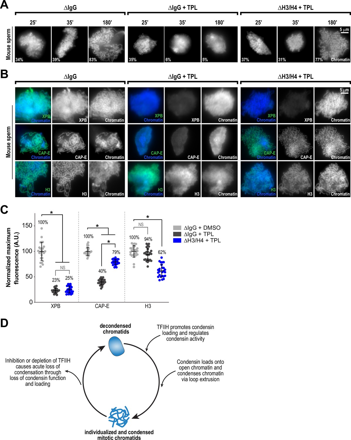 Figure 5. Partial histone H3/H4 depletion rescues chromosome condensation in the absence of TFIIH activity. (A) Representative fluorescence images of mouse sperm nuclei incubated with âIgG or âH4K12ac extracts and spun onto coverslips at indicated timepoints. DMSO or Triptolide were added at t = 25â, immediately after sample acquisition for imaging. Chromatin was stained with Hoechst. Mean condensation parameters for each condition are indicated in lower left corner of each image. (B) Representative immunofluorescence images of mouse sperm nuclei incubated with âIgG or âH4K12ac extracts for 180 min. DMSO or triptolide were added at t = 25â. Chromatids were labeled with anti-XPB, anti-CAP-E (condensin I and II), or anti-histone H3, and co-stained with Hoechst. (C) Quantification of fluorescent intensity of indicated proteins from (B), normalized to DMSO. n = 50 structures for each condition. Error bars represent SD, and asterisks indicate a statistically significant difference (*, p < 0.001). A.U., arbitrary units. Two biological replicates were performed, quantified structures are from a single experiment. (D) Model depicting the role of the TFIIH complex in regulating condensin dynamics. Our data are consistent with a model in which TFIIH alters the chromatin environment to allow condensins to load and extrude loops of DNA. |