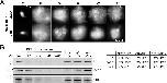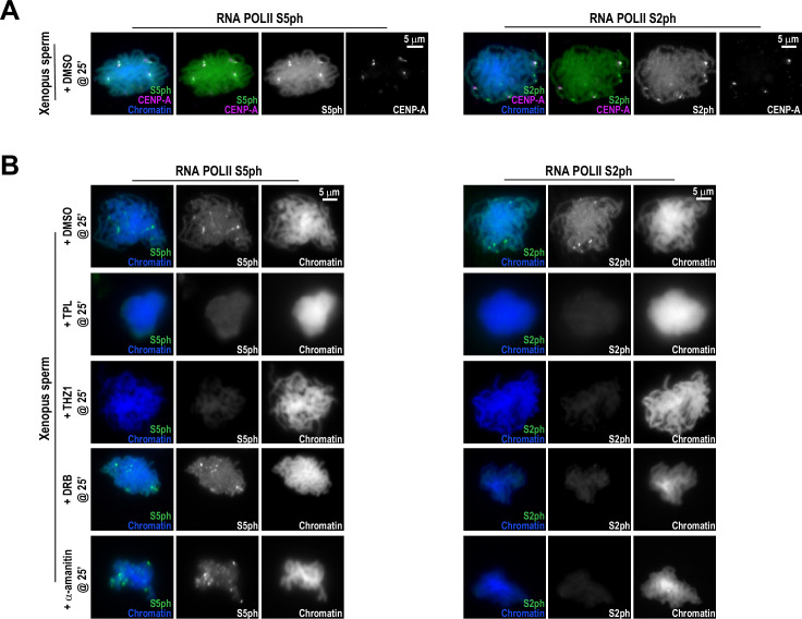 Figure 1-Figure Supplement 2: Effects of various transcription inhibitors on RNA Polymerase II C-terminal phosphorylation at centromeres. (A) Representative immunofluorescence images of Xenopus sperm nuclei incubated in HSS extracts for 180 min. DMSO was added at 25 min as a control. Chromatids were labeled with Hoechst, either anti-Pol II S5ph (paused) or anti-Pol II S2ph (elongating), and co-stained with anti-CENP-A antibodies. (B) Representative immunofluorescence images of Xenopus sperm nuclei incubated in DMSO, triptolide (TPL), THZ1, DRB, or alpha-amanitin treated HSS extracts for 180 min. All inhibitors were added 25 min after sperm addition. Chromatids were labeled with Hoechst, anti-Pol II S5ph, or anti-Pol II S2ph antibodies. |